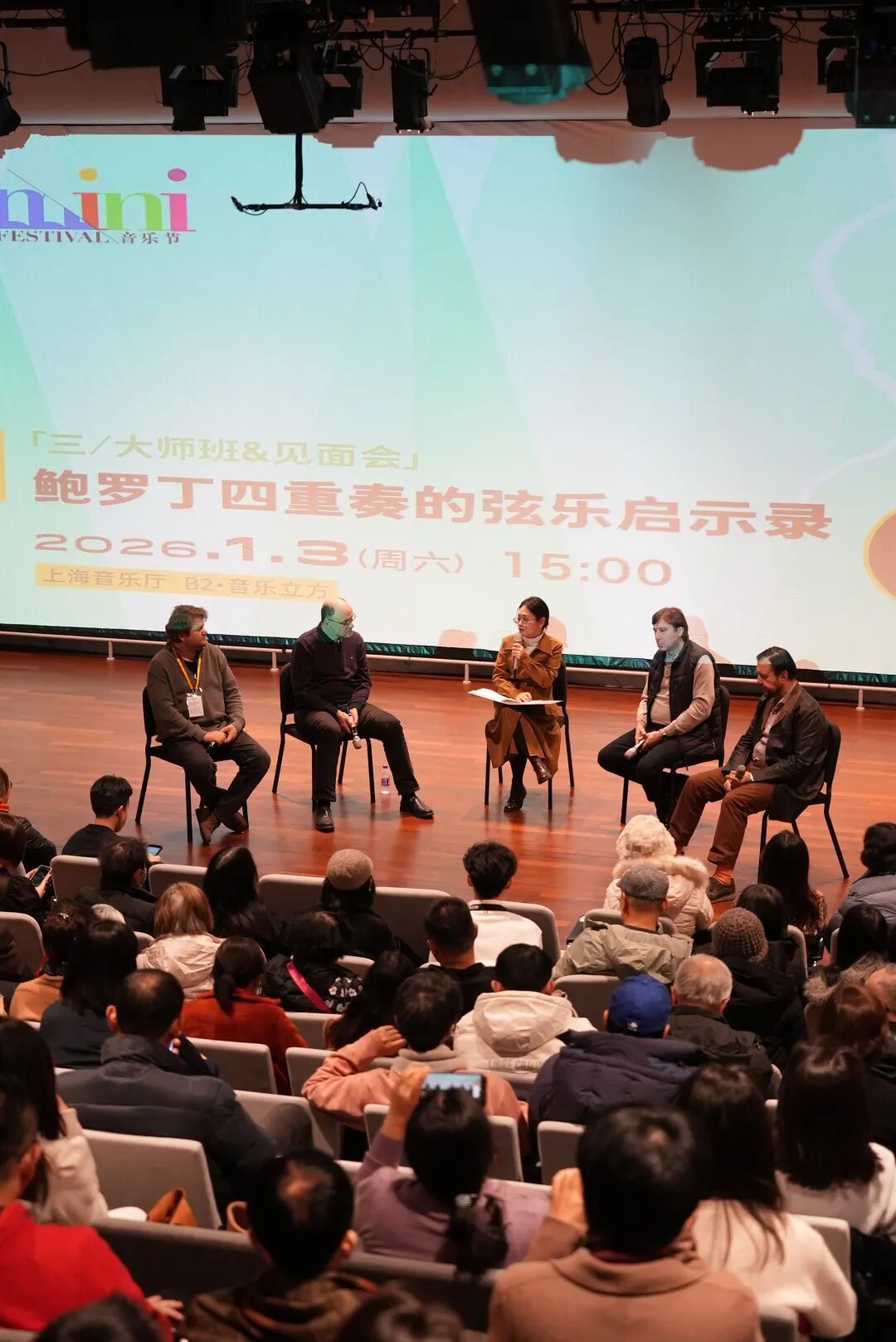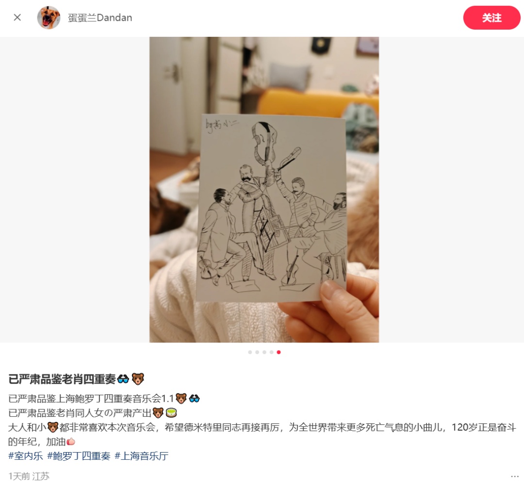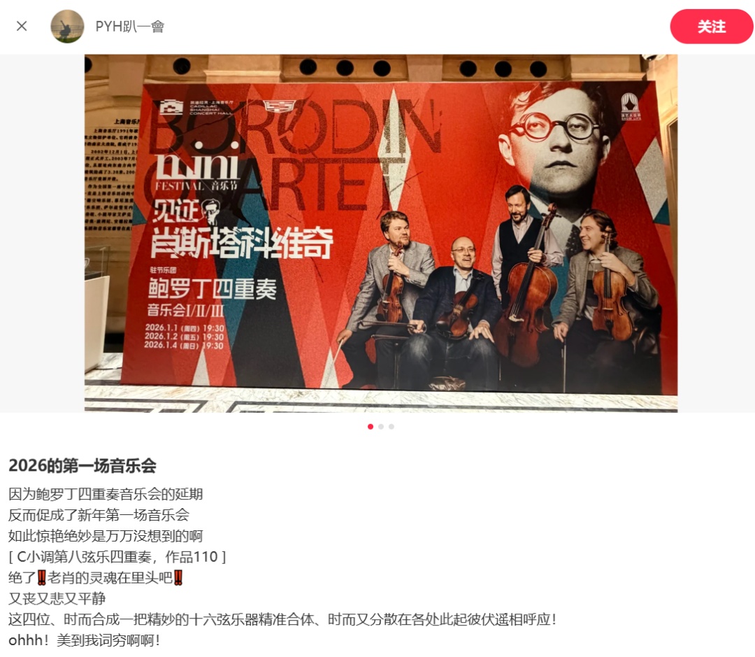 1月4日的收官音乐会,从贯穿DSCH签名动机的《降B大调第五弦乐四重奏》,到情感极致浓缩的单乐章作品《降B小调第十三弦乐四重奏》,最终在《降E小调第十五弦乐四重奏》的悠长旋律中落下帷幕。鲍罗丁四重奏用温柔而坚定的旋律回应观众的热情,这份跨越时空的音乐共鸣,成为了珍贵的记忆。
