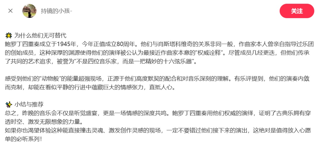三天的音乐会,鲍罗丁弦乐四重奏演绎肖斯塔科维奇弦乐四重奏,体现出一种深植于传统之中的内在理解力。他们不刻意放大戏剧冲突,而是以高度统一的音色、严谨的结构意识和稳定的合奏精度,呈现出作品内部持续而克制的张力。其演奏强调线条的连贯性与声部之间的内在对话,使音乐中的压抑、讽刺与悲剧性并非以外在的激烈手段呈现,而是通过长时间的积累与控制逐渐显现。这种演绎方式或许不以锋芒毕露取胜,却在冷静、沉着与历史厚度中,揭示了肖斯塔科维奇弦乐四重奏所特有的精神重量。