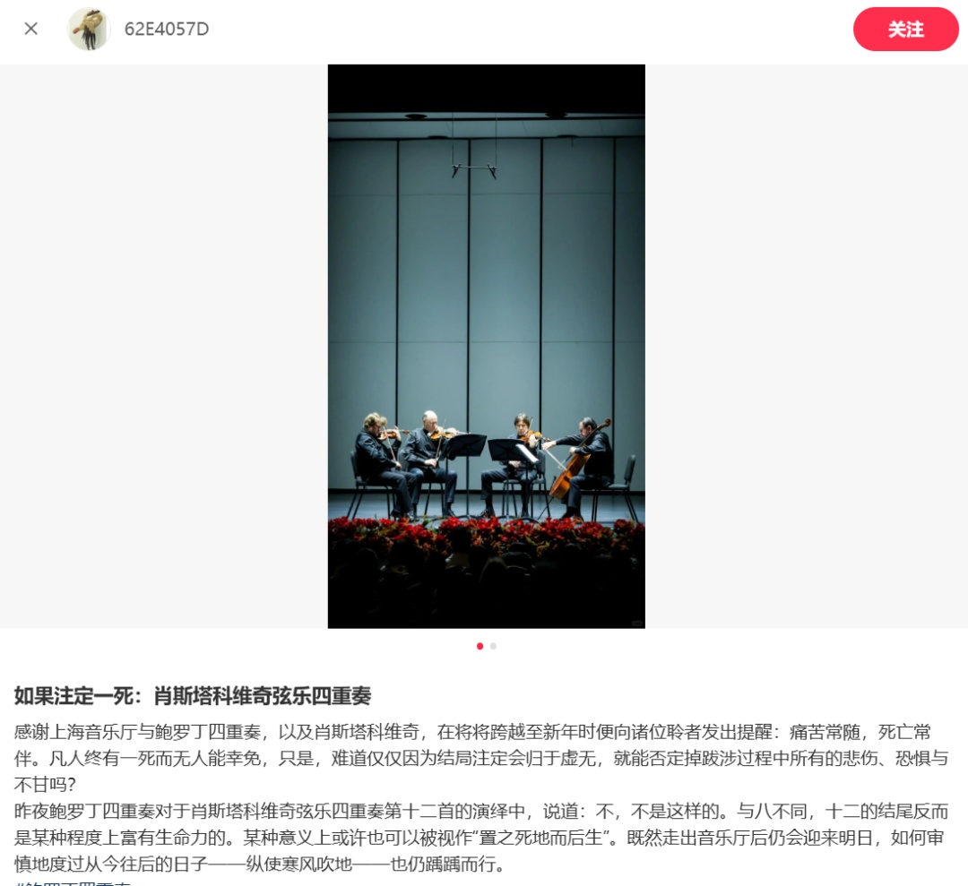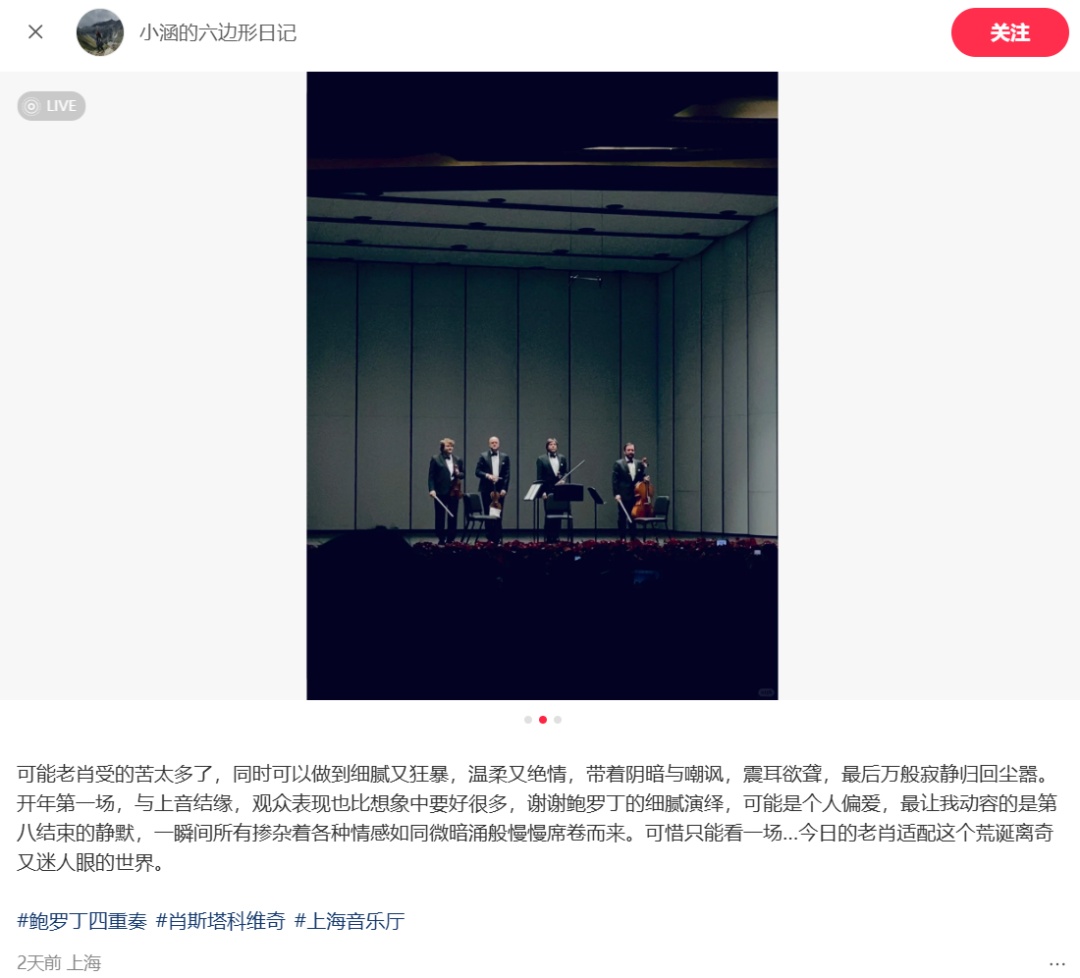 肖斯塔科维奇的15部弦乐四重奏与15部交响曲并列为创作核心,音乐围绕他对个人与时代命运的反思。今晚(1月1日),老肖四重奏作品的权威诠释者、与二战胜利同龄的鲍罗丁四重奏演奏了肖一、三和八。肖八以"DSCH"签名动机贯穿,四重奏独有的音色、呼吸承载了作品创伤、孤独、生死哲思与情感独白。