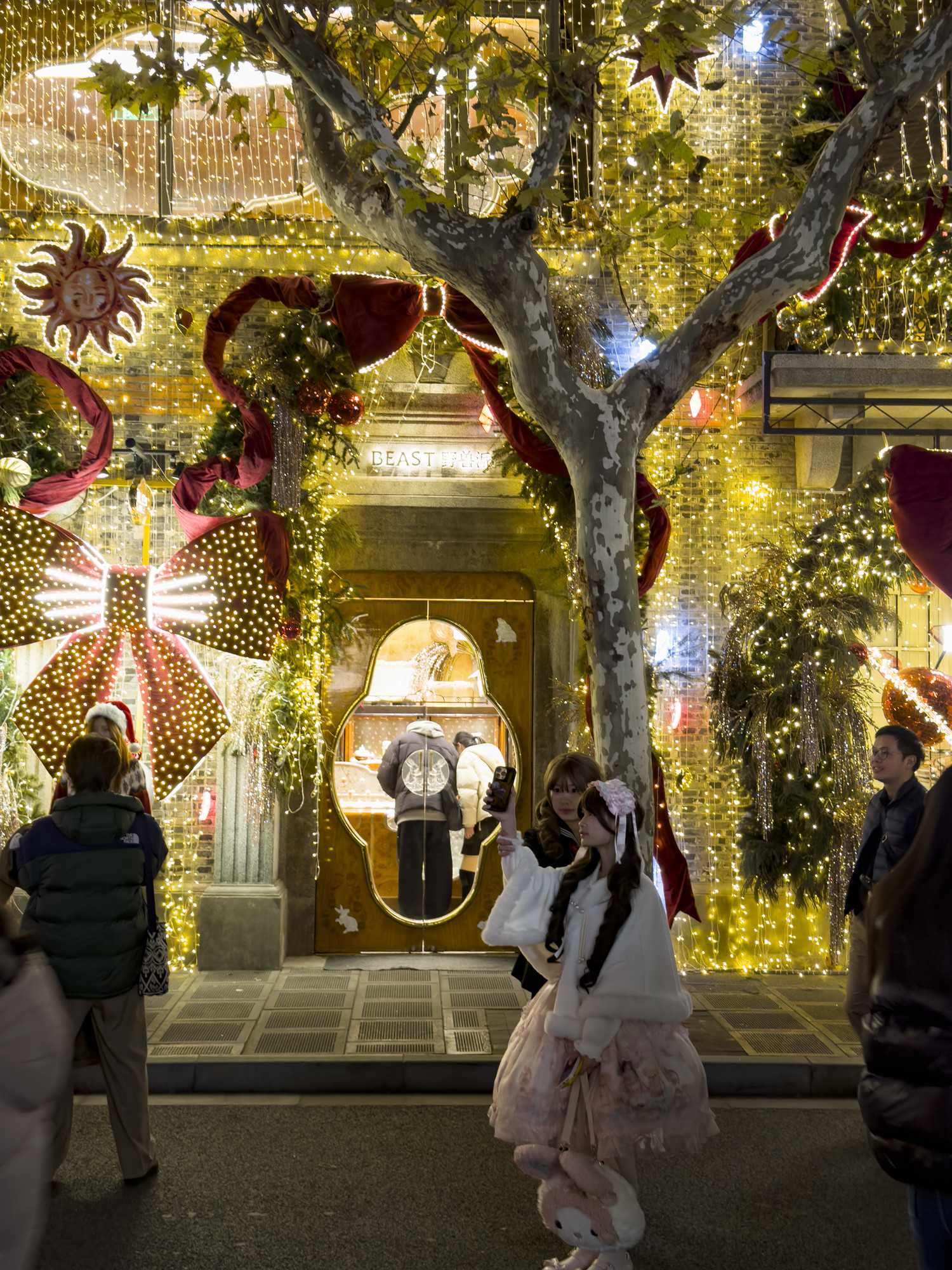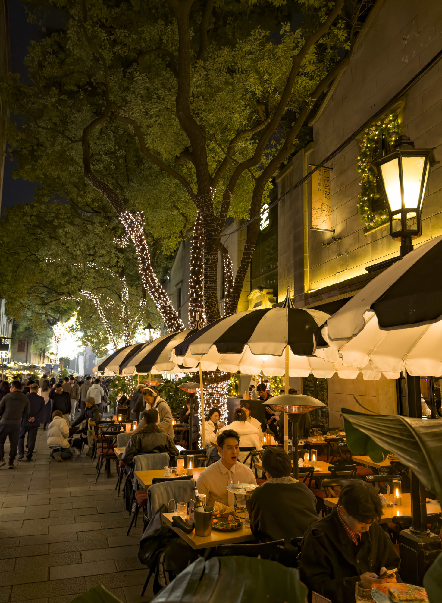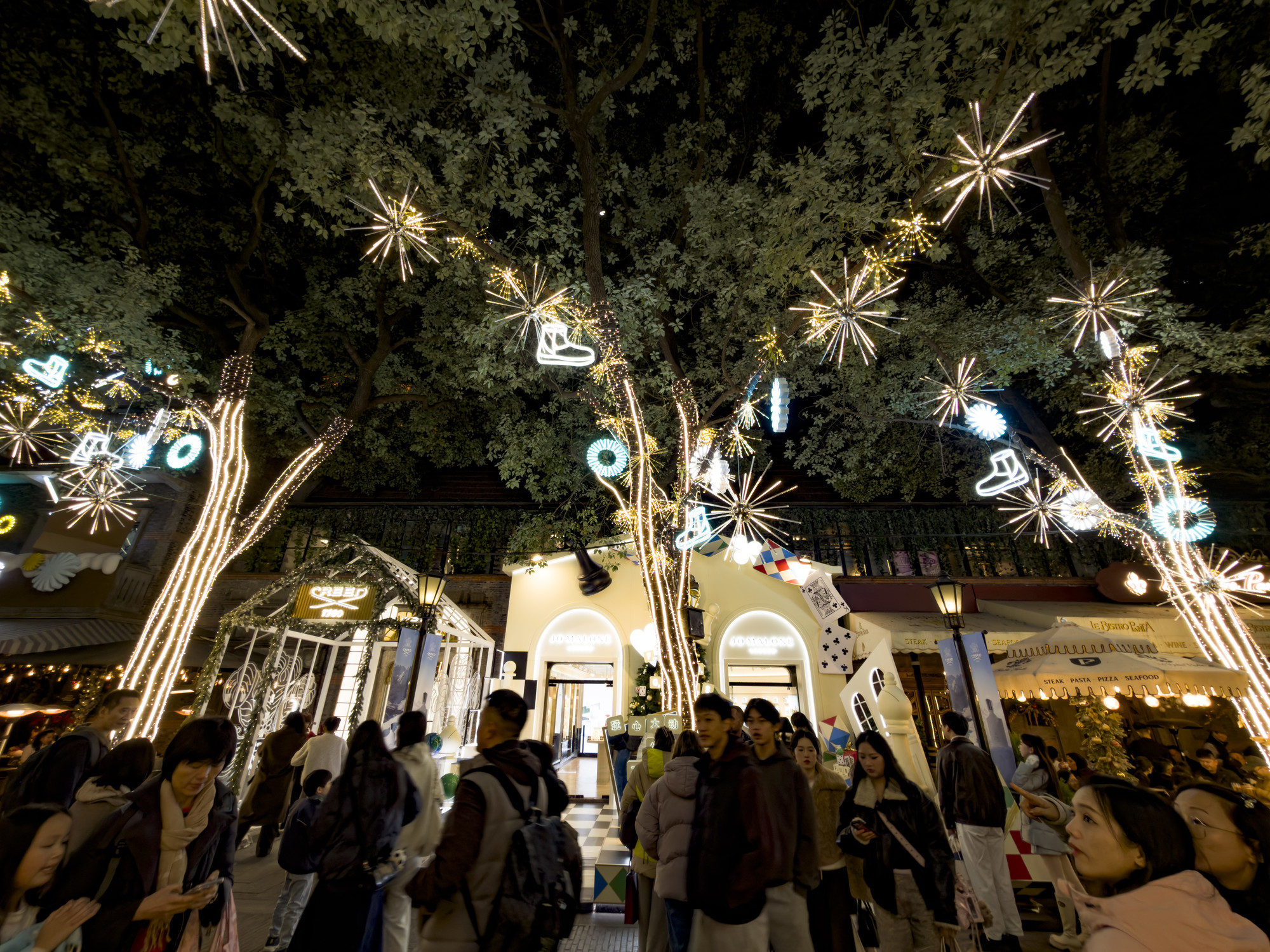 新天地南里商场的玻璃幕墙上,“新年快乐”的祝福语如烟火绽放,与沿街店铺暖光摇曳的橱窗相映,点亮整条街道。北里的树木缀满星辉,宛若火树银花;装饰金色垂帘的灯树与缠绕灯串的复古路灯下,中外游客举杯畅饮,笑语交融,酒香漫入夜色——打卡的闪光此起彼伏,与灯光、笑脸汇成一片绚烂。