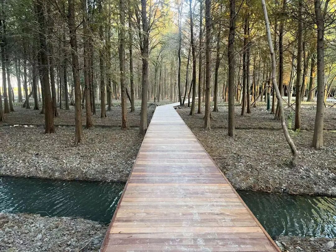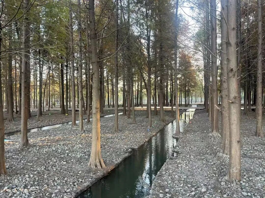 湿地总面积约119亩,坐落于上海黄浦江上游水源保护区内,东邻林地、西接乡界泾、南至新九路、北近黄浦江,坐拥天然洼地湿地的生态本底。项目以特色“膝根”景观为核心,通过科学的水系梳理、植被优化与生态营造,打造跌水景观,贯通水系沟渠,构建出水质清澈、物种丰富的湿地生态空间。区域内以池杉、落羽杉、水杉为特色树种,划分林下溪流、林间观鸟区、膝根观赏区和水上森林四大主题区域。其中,林下溪流潺潺,串联起成片杉林,绘就灵动画卷;林间观鸟区植被茂盛,成为白鹭、黑水鸡等野生鸟类的理想栖息家园;水上森林以“树在水中长,水在林间流”的独特景致,勾勒出诗意盎然的湿地风光。