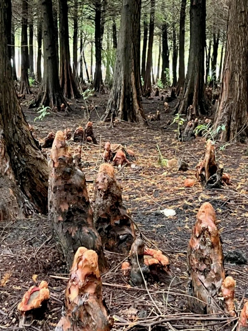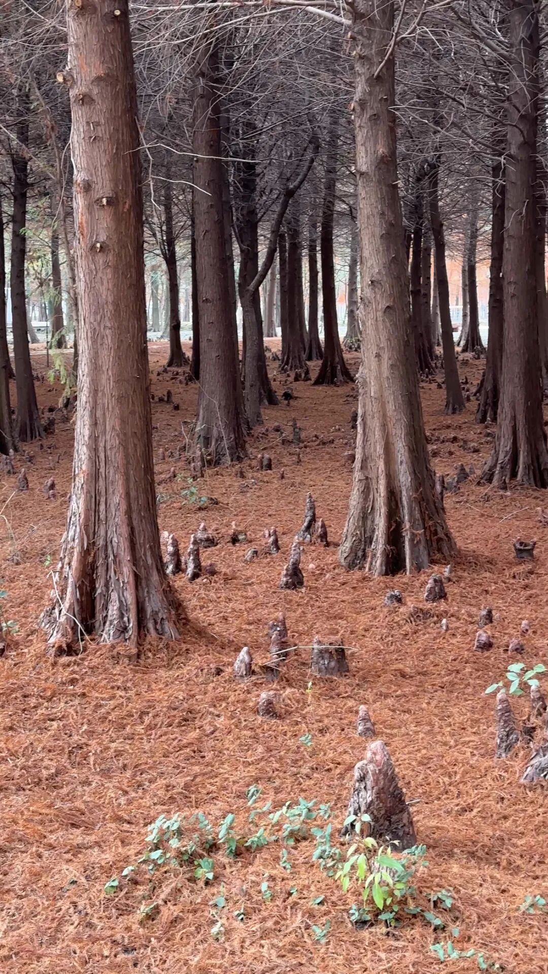 “膝根是杉科植物的‘生存智慧结晶’。为适应湿地潮湿缺氧的生长环境,这类植物演化出特殊根系,从水中或淤泥里奋力向上生长,露出地面。”区林业站相关负责人介绍,这一独特结构既能帮助植株“呼吸”新鲜空气,又能稳稳支撑树干。更妙的是,膝根兼具生态价值与自然美学价值,有的弯曲如弓,有的挺拔如笋,形态别致、野趣十足。