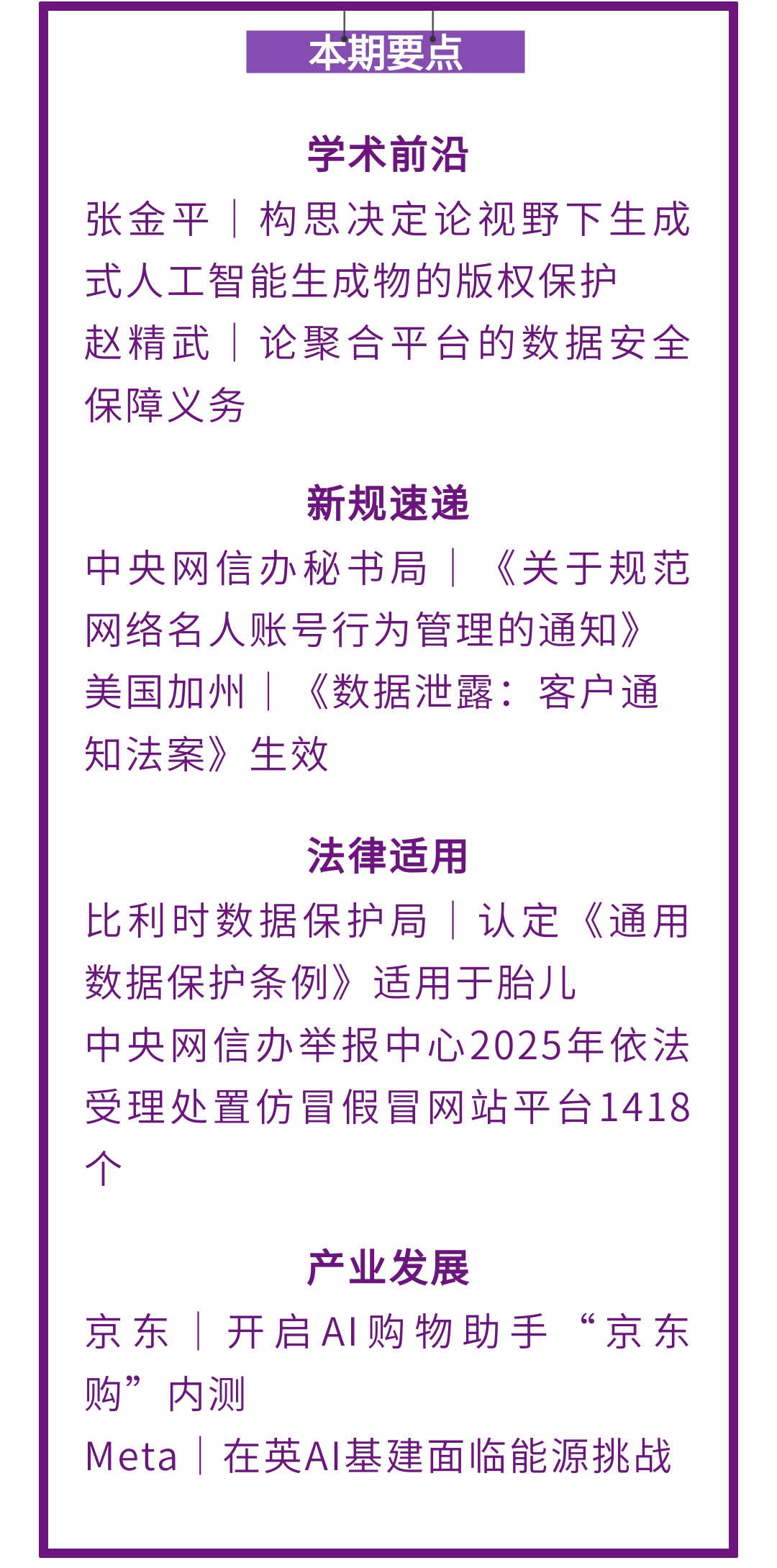 在算法治理语境中,算法透明被视为一种解决算法黑箱问题的主要机制。算法透明机制已得到广泛讨论,在理论上发展出以技术披露和决策解释为核心的双线模式。双线模式要求算法技术能够被公众“看透”或“理解”。但该模式未能充分考虑算法可解释性障碍和公众认知局限,在实践层面遭遇来自技术和制度的双重挑战,这可能导致透明机制的失效和透明度期待落空。鉴于可解释人工智能的技术属性,伴随以算法信任为核心的治理理念的兴起,我们需要反思算法透明机制的局限,完善面向公众的算法透明机制。这种“面向公众的算法透明机制”应当以提升公众信任为目标,将透明机制作为信任沟通的工具,向公众传递有助于算法可信度评估的重要信息,建立真正服务于公众的算法透明机制。(全文刊《华东政法大学学报》2025年第1期)戴维,北京大学法学院博士研究生;王锡锌,北京大学法学院教授,法学博士。中央网信办秘书局|《关于规范网络名人账号行为管理的通知》2025年12月25日,中央网信办秘书局发布《关于规范网络名人账号行为管理的通知》,并附网络名人账号行为负面清单,要求各地网信部门及网站平台加强对网络名人账号的常态化管理。通知指出,网络名人账号因粉丝数量大、社会关注度高,在互联网上具有较强影响力和示范效应。为防范不当网络言行造成负面影响,清单明确列出十三类禁止行为,包括传播低俗内容、宣扬不良价值导向、打造审丑人设、传播不实信息、歪曲解读政策和公共事件、鼓动群体对立、随意开盒挂人、组织约架论战、征集负面线索、号召粉丝聚集、实施利益要挟、开展无资质运营、隐蔽从事黑灰产等。各网站平台需对照负面清单健全管理规则,依法加强网络名人账号发布信息、直播互动等行为管理。各地网信部门要履行属地管理责任,督促平台做好规范管理工作。(中央网信办秘书局)