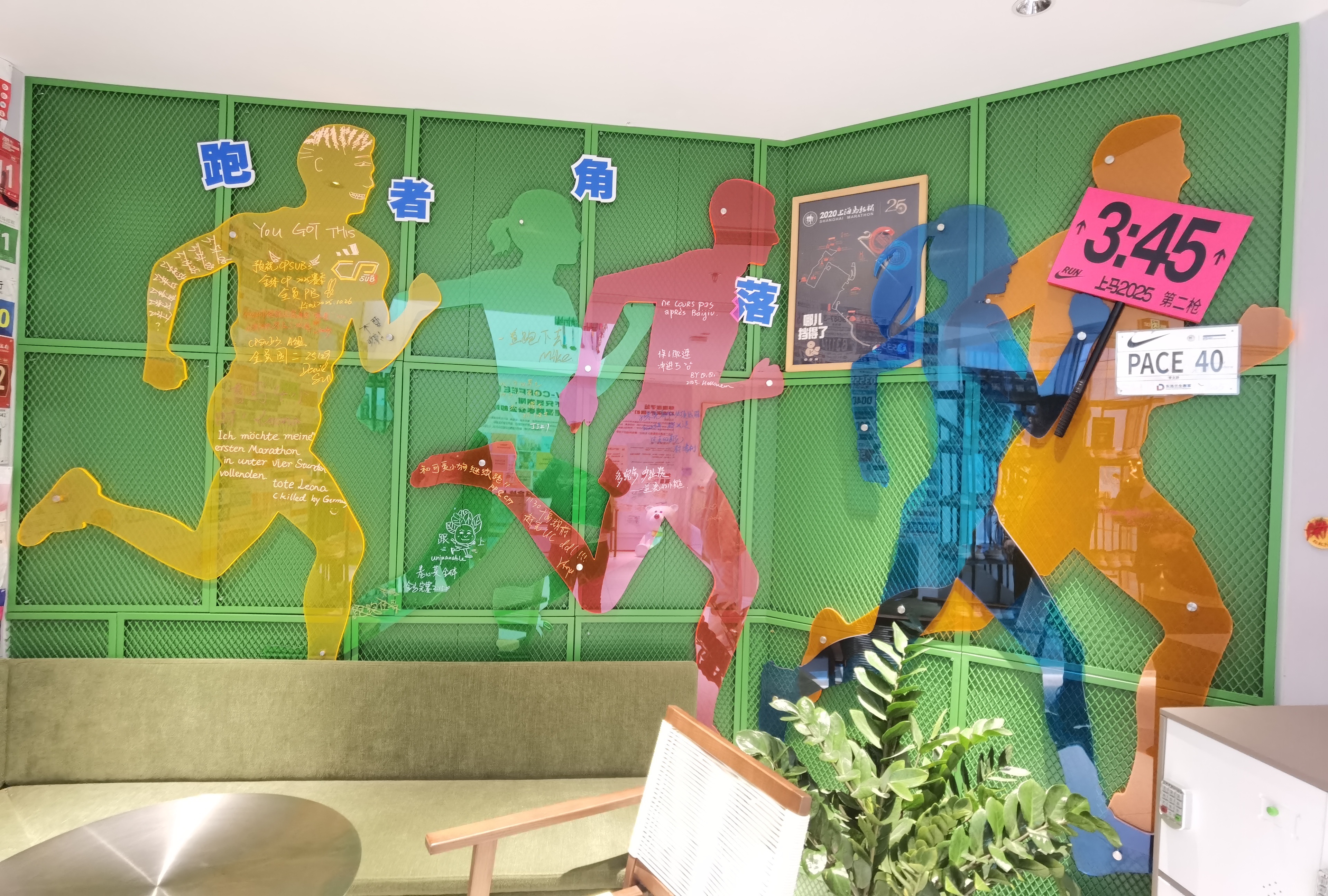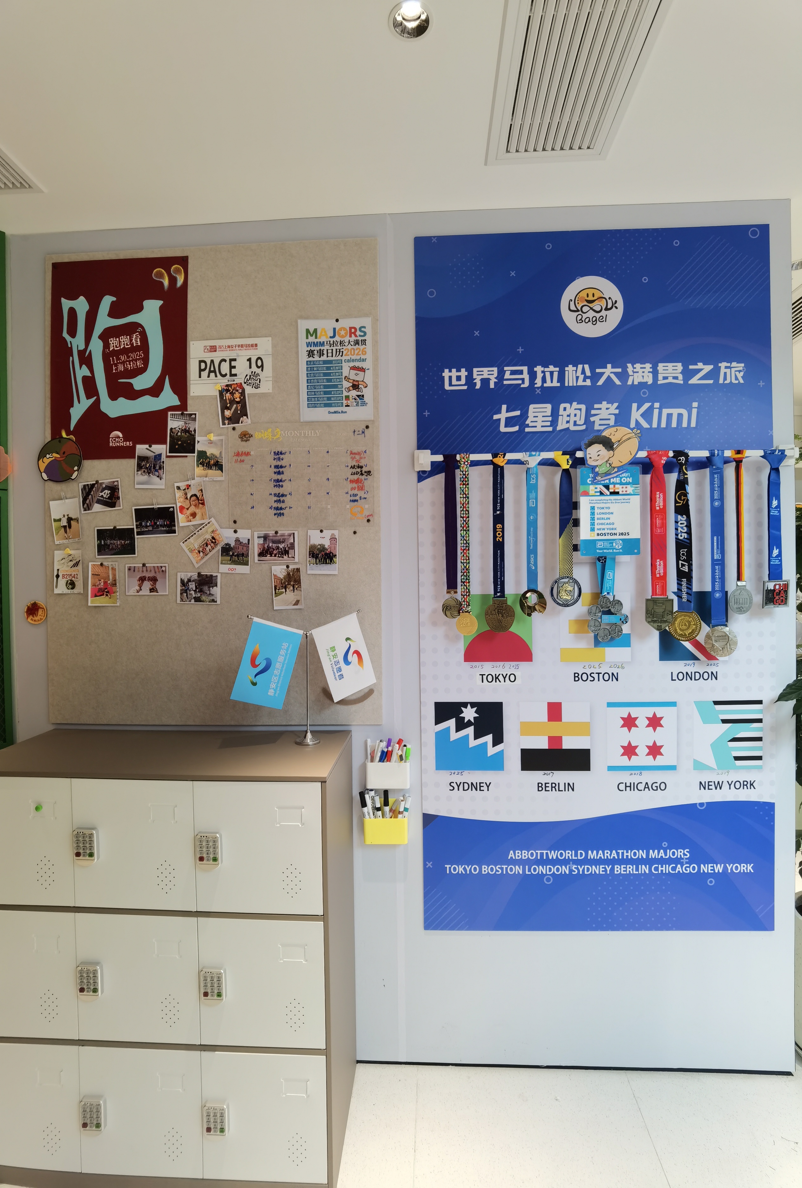 走进“跑者驿站”,跑步主题元素随处可见:满墙的马拉松奖牌和号码簿、国内外跑者的留言和照片……为更精准地保障跑团这一青年自组织所需要的基础设施,驿站还配备了跑鞋架、储物柜、洗澡间等共享功能。