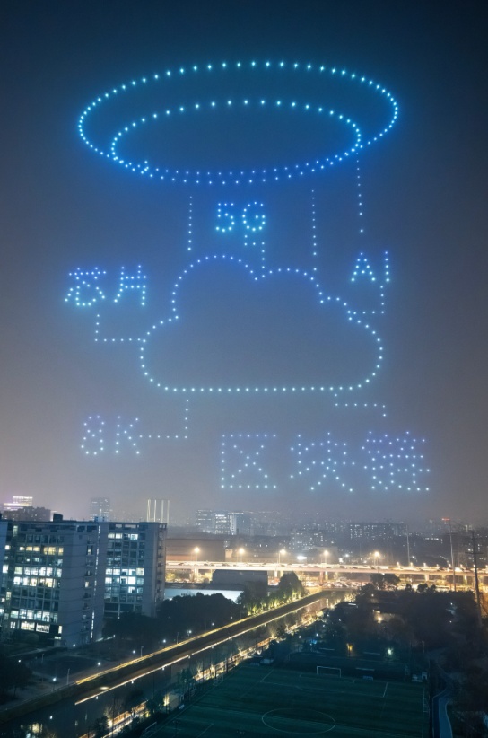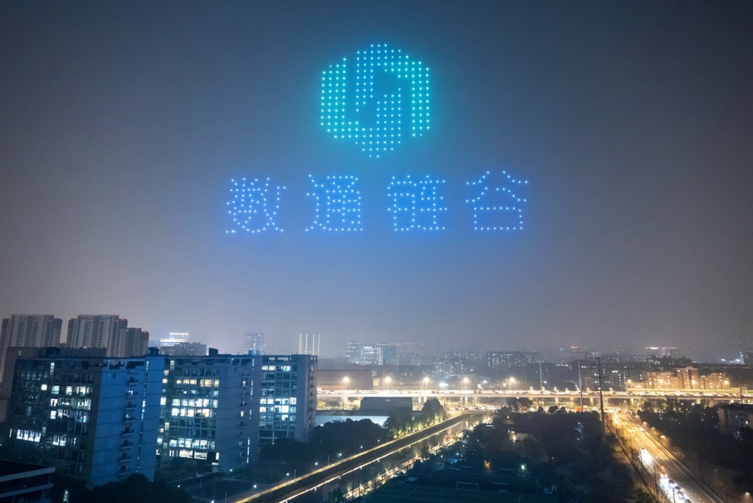 当晚6时,无人机群齐飞,如星雨洒落,依次幻化成“市北高新”标识、“数通链谷”蓝绿交织的六边形符号及“数据港”logo,生动勾勒出园区在区块链、超高清视听、低空经济、具身智能等前沿领域的布局。