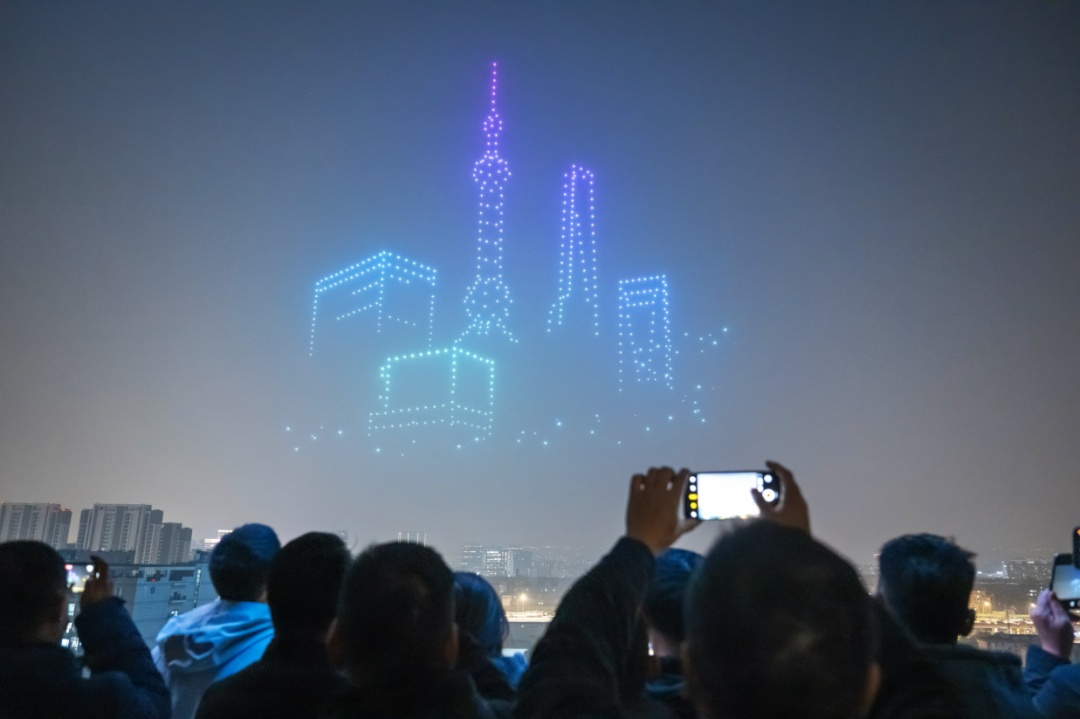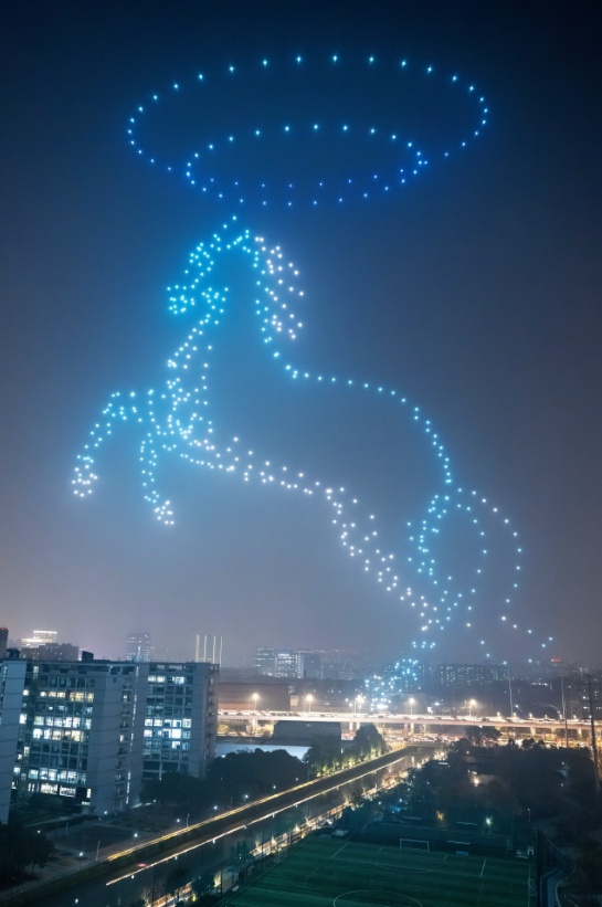 夜幕降临,华灯初上。1月5日晚,在市北高新数通链谷上空,500架无人机以天为幕、以光为笔,上演了一场题为“天马行空·智链新元”的璀璨表演。