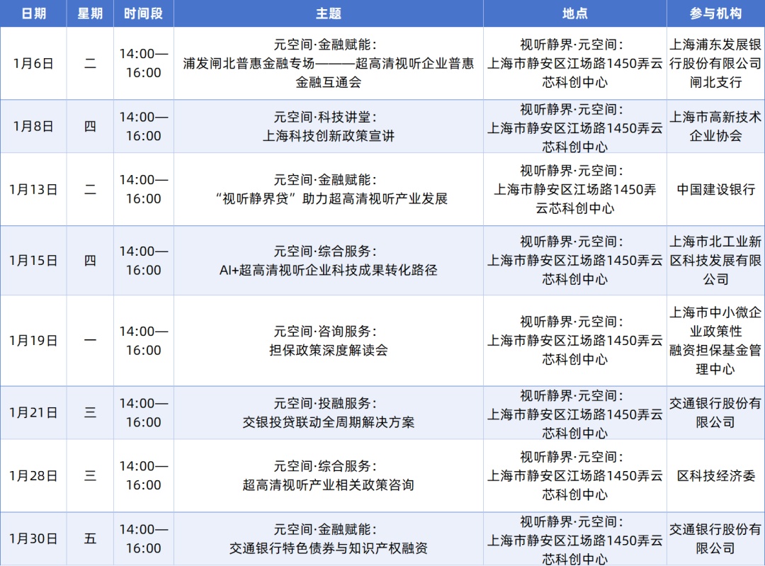 超高清视听产业相关政策咨询、普惠金融互通会、人才政策咨询、文创政策咨询、法务咨询、信贷服务咨询、产教融合沙龙、企业注册咨询、科技创新政策宣讲、OPC创业路径规划、超高清技术讲堂、生成式AI讲堂、特色债券与知识产权融资等。