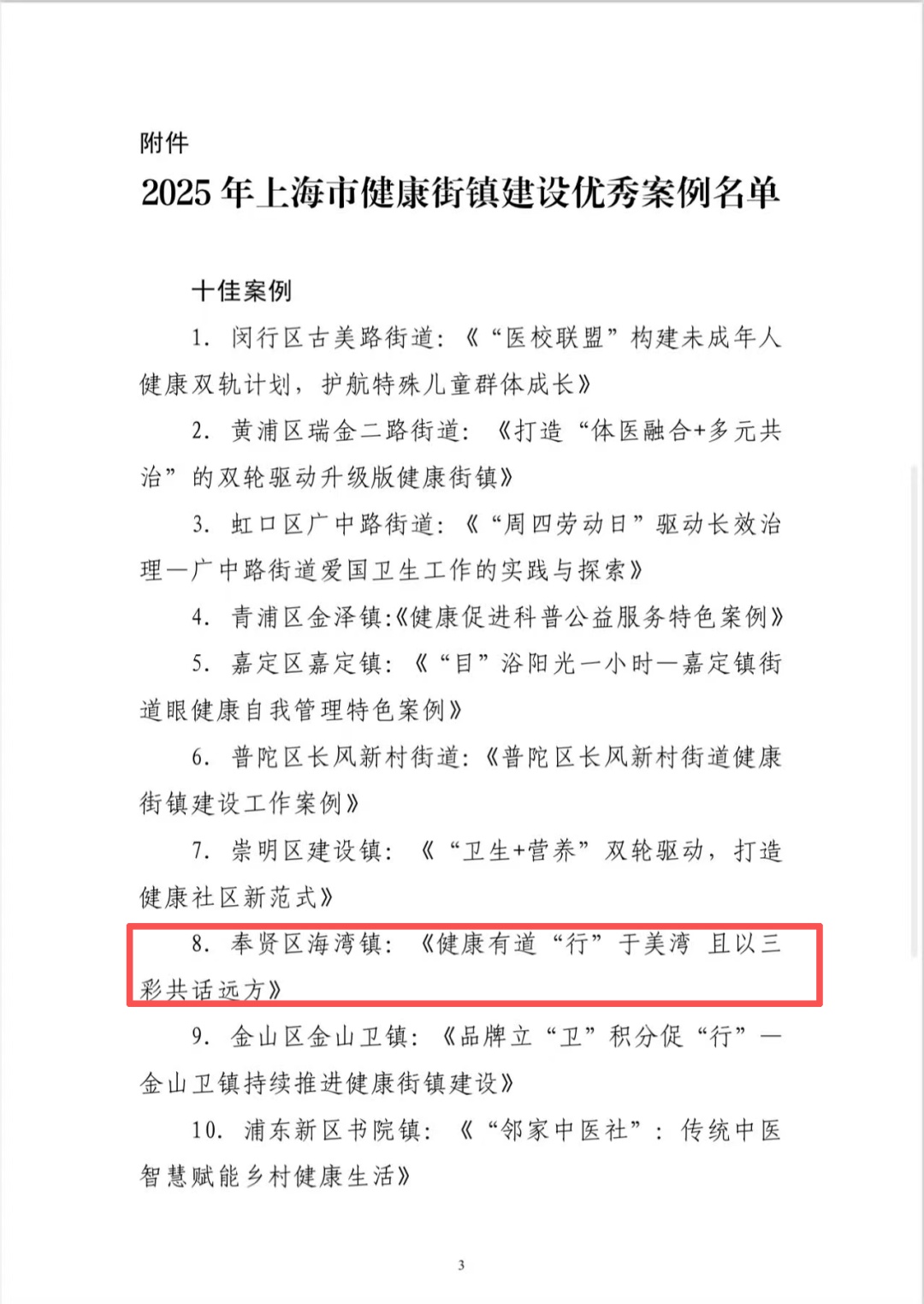 为贯彻落实“健康优先发展战略”,深入实施爱国卫生运动和健康上海行动,强化政策合力,更好地推进面向社区居民的健康服务导入,市爱卫会办公室围绕“健康环境改善、健康生活方式引导、基层健康阵地建设、健康服务提质升级”等重点,全面纵深推进上海市健康街镇常态化建设。经专家两轮评审,评选出2025年上海市健康街镇建设十佳案例和20个优秀案例,其中海湾镇报送的案例《健康有道“行”于美湾且以三彩共话远方》成功入选上海市健康街镇建设十佳案例。
