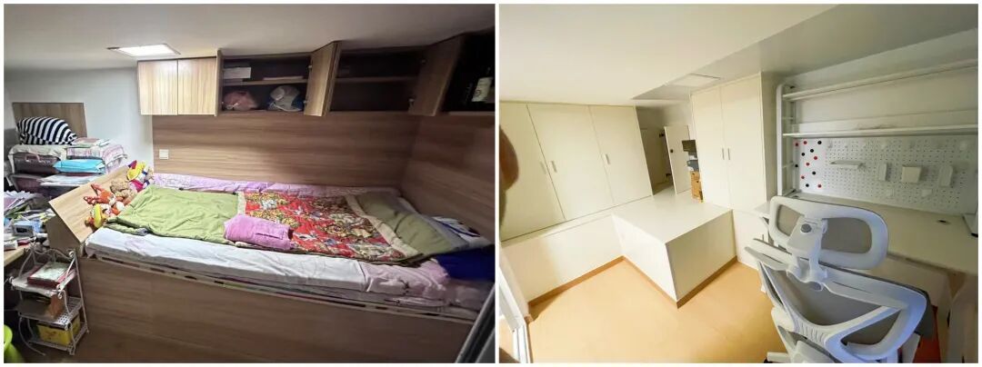 小莉(化名)与姐姐、父母共住在9平米的房间,针对学习生活空间混杂的实际困难,设计师应用三维扫描技术对楼梯底部、夹角空间等零散区域进行科学分区改造。根据一室户不同时段需求,配置自动调节亮度环境灯组,以“螺蛳壳里做道场”的空间利用率,划分出生活与学习区域,最大限度改善青少年居住品质。