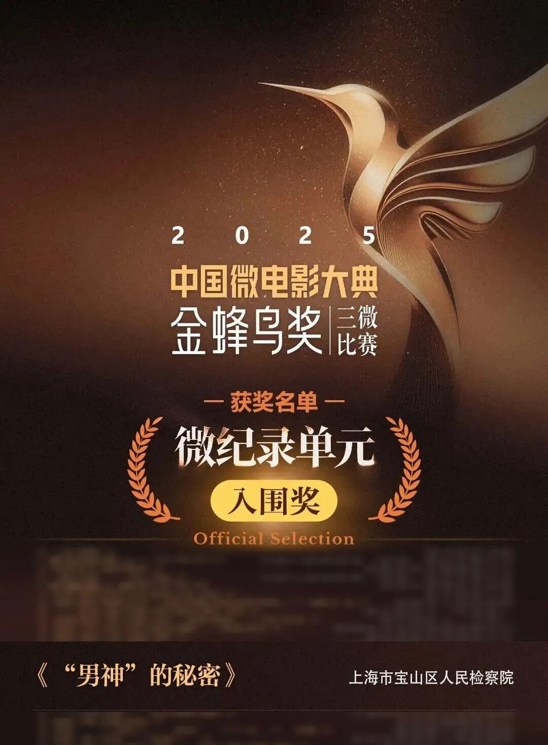 2025·中国微电影大典“金蜂鸟奖”三微比赛历经层层筛选与评委会的严谨评审,获奖表彰名单正式出炉。其中,上海市宝山区人民检察院的作品《“男神”的秘密》获微纪录单元入围奖。