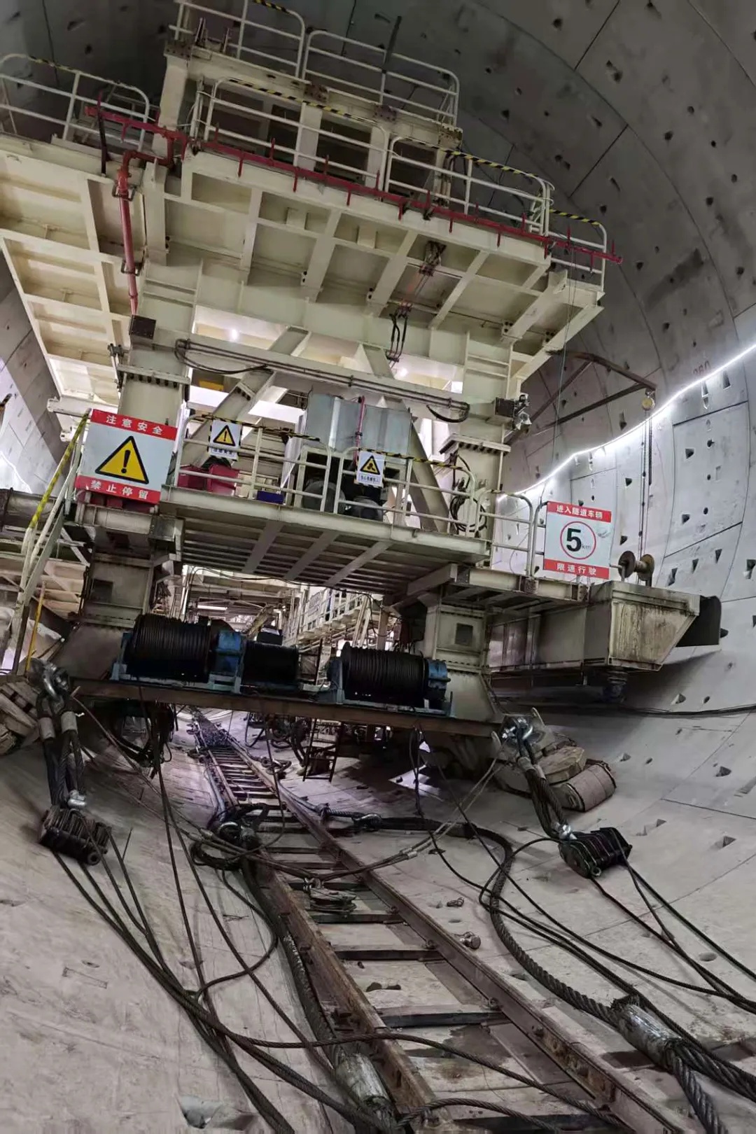 施工前,技术人员全面勘察检测贯通隧道内的管片结构,逐一排查安全隐患,确保管片结构稳定无损伤,能够承受倒拉荷载。施工中,项目团队精准定位管片预设锚点,固定卷扬机挂钩,构建稳定牵引体系,利用盾构机内多台大功率卷扬机平稳拉动盾构机车架。现场严格落实“一机一人”管控制度,管理人员实时监控设备参数,安全监督人员全程旁站,及时排除风险隐患。