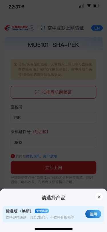 填写相关信息并点击“立即上网”,选择使用“标准版(焕新)”。(根据旅客认证信息及购票舱位自动识别)