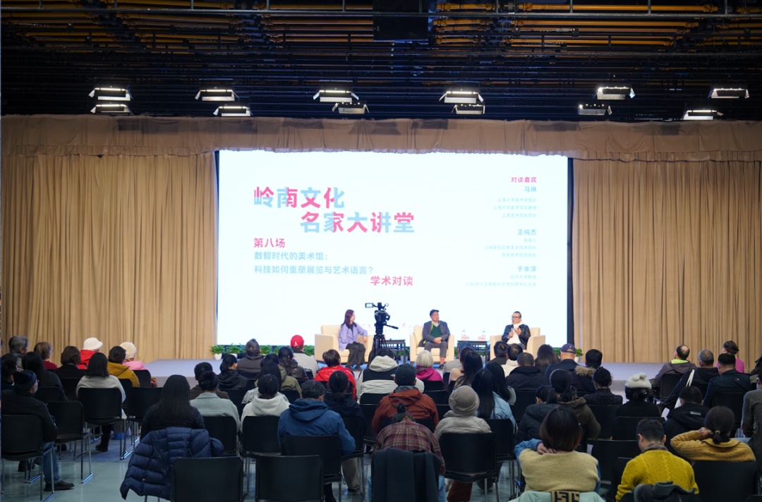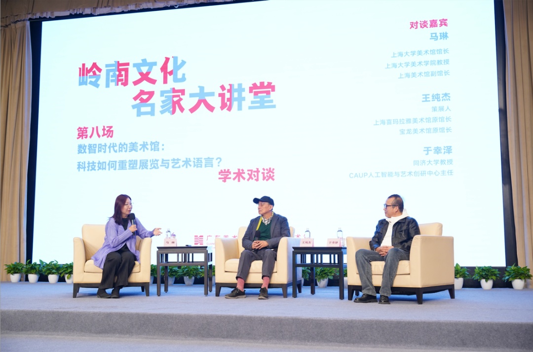 在“岭南文化名家大讲堂”系列学术脉络的持续深化中,随着对岭南画派历史本体与艺术精神的探讨渐次展开,一个更具时代性与前瞻性的命题自然浮现——当技术浪潮席卷一切,艺术的创作、展示与感知方式正经历何种根本性重构?本次讲座特邀上海大学美术馆馆长马琳作主题演讲,并与上海喜玛拉雅美术馆原馆长、宝龙美术馆原馆长王纯杰,同济大学人工智能与艺术创研中心主任于幸泽展开深度对谈。三位学者与实践者围绕“数智时代的美术馆:科技如何重塑展览与艺术语言”这一前沿课题,展开了一场跨越策展学、艺术创作与技术哲学的思辨对话,旨在探寻在算法与数据日益深入艺术核心的今天,美术馆如何保持其人文内核,并演化出新的文化生命力。