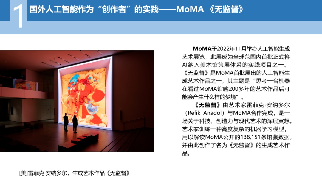MoMA于2022年11月举办了全球范围内首批正式将人工智能纳入美术馆策展体系的实践项目——《无监督》展。展览中呈现了一件人工智能生成作品,艺术家让人工智能作为创作主体,解读MoMA馆藏数据生成实时变化的影像,是一场关于科技创造力与现代艺术的深度冥想。这项实验侧重于对生成艺术的探索,更多强调将人工智能作为创作主体,以重构艺术史叙事并挑战人类感知边界。