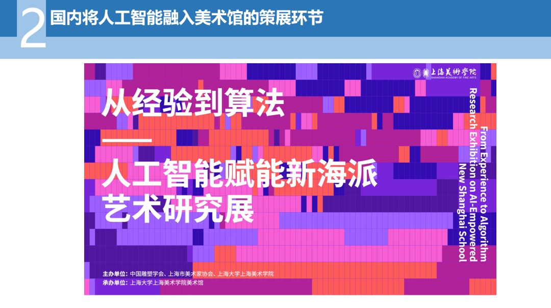 马琳重点提及了上海大学上海美术学院在“从经验到算法——人工智能赋能新海派艺术研究展”中的实践和探索。展览团队通过智能生成、人工智能成为策展的机器、教学的未来三大板块的探索,印证了人工智能可提升策展效率的可能。