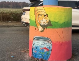 电线杆底采用多巴胺风格的毛线进行编织装饰,部分略有磨损的桩基更被妙笔绘成“小猫抓鱼”的趣味画面,化瑕疵为艺术,尽显改造的用心与“变废为美”的巧思。
