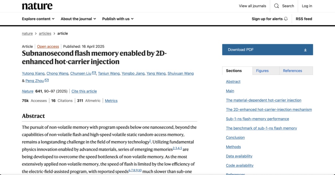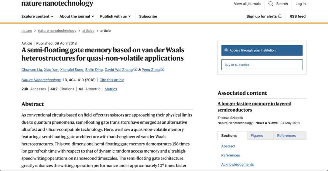 转折发生在2018年。团队利用二维材料易于异质集成的特性,构建了一个二维半浮栅闪存结构,将存取速度提升至10纳秒量级。这项成果成功发表于纳米技术领域国际期刊Nature Nanotechnology上,也是第一篇闪存技术相关成果。