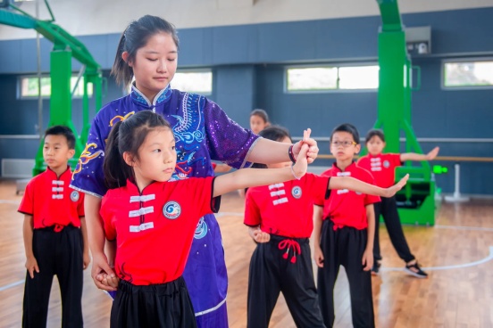 除常规体育课与专项课外,学校对全时段体育活动进行系统谋划,让运动融入校园每一段时光。晨练时光伴着轻快音乐开启,学生们慢跑热身、唤醒活力;上下午的“乐动大课间”时分,普修、选修、特色、个性四类“菜单式”项目精准覆盖不同需求,实现从普及到特长的全阶适配;午间20分钟的“漫运动”时光更显惬意,学生们或漫步赏景,或习练五禽戏、八段锦,或参与投壶、拍元宝等民间体育游戏,低负荷的运动形式既舒缓情绪,又让孩子们充分享受阳光与活力。