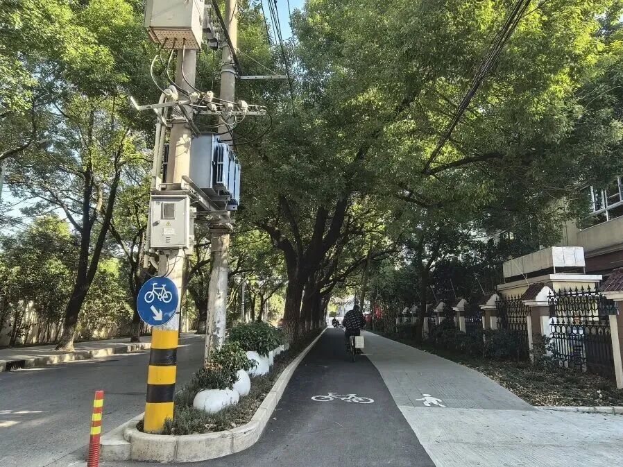 早晨七点半,家住闵行区七宝镇宝南小区的李阿姨像往常一样,骑着电动车送孙子上学。行至宝南路新镇路口,她熟练地拐上一条新铺的黑色非机动车道,与身旁人行道上的行人互不干扰,以往那种与汽车擦身而过的紧张感已不复存在。