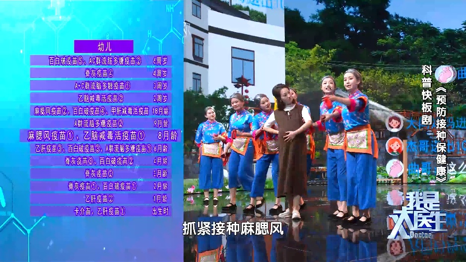 “新生儿,要记牢,接种乙肝卡介苗;二月龄,去打针,脊灰疫苗进身体;八月娃娃闹哄哄,抓紧接种麻腮风”,从新生儿到六岁儿童的免费疫苗接种时间,搭配大屏同步展示的月份对照表,一目了然。更是针对老年人科普流感疫苗、带状疱疹疫苗的重要性,打破“老人不用打疫苗”的误区,让依法接种、科学防护的理念深入每个家庭。还有哪些藏在接种时间表后的关键细节,明晚将在快板中为您详细讲解!