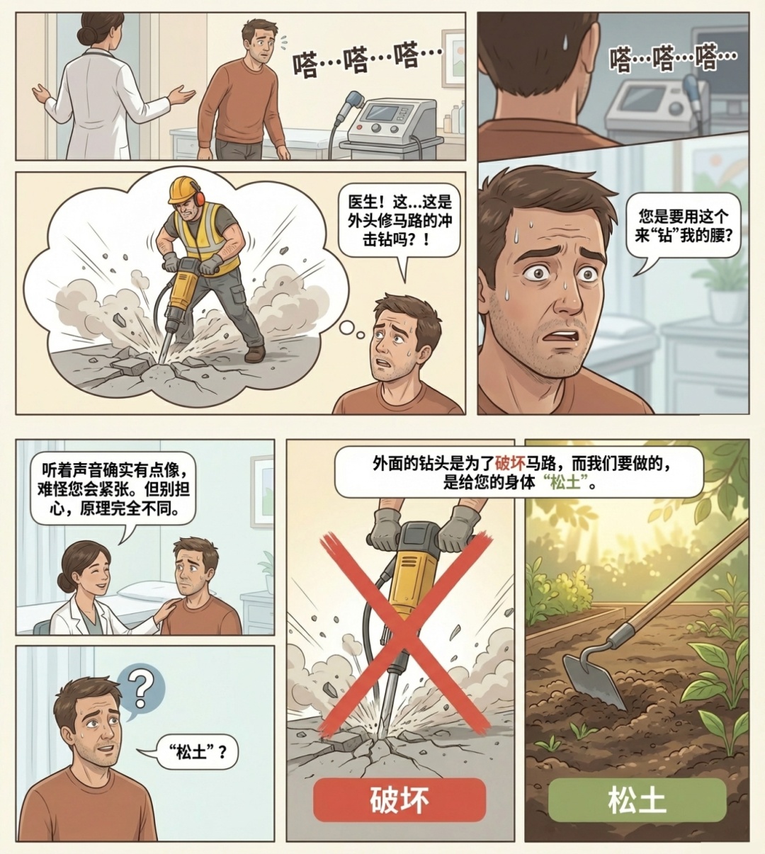 听着声音确实有点像外面的冲击钻,但别担心,原理完全不同。外面的钻头是为了破坏马路,而我们要做的,是给您的身体“松土”。