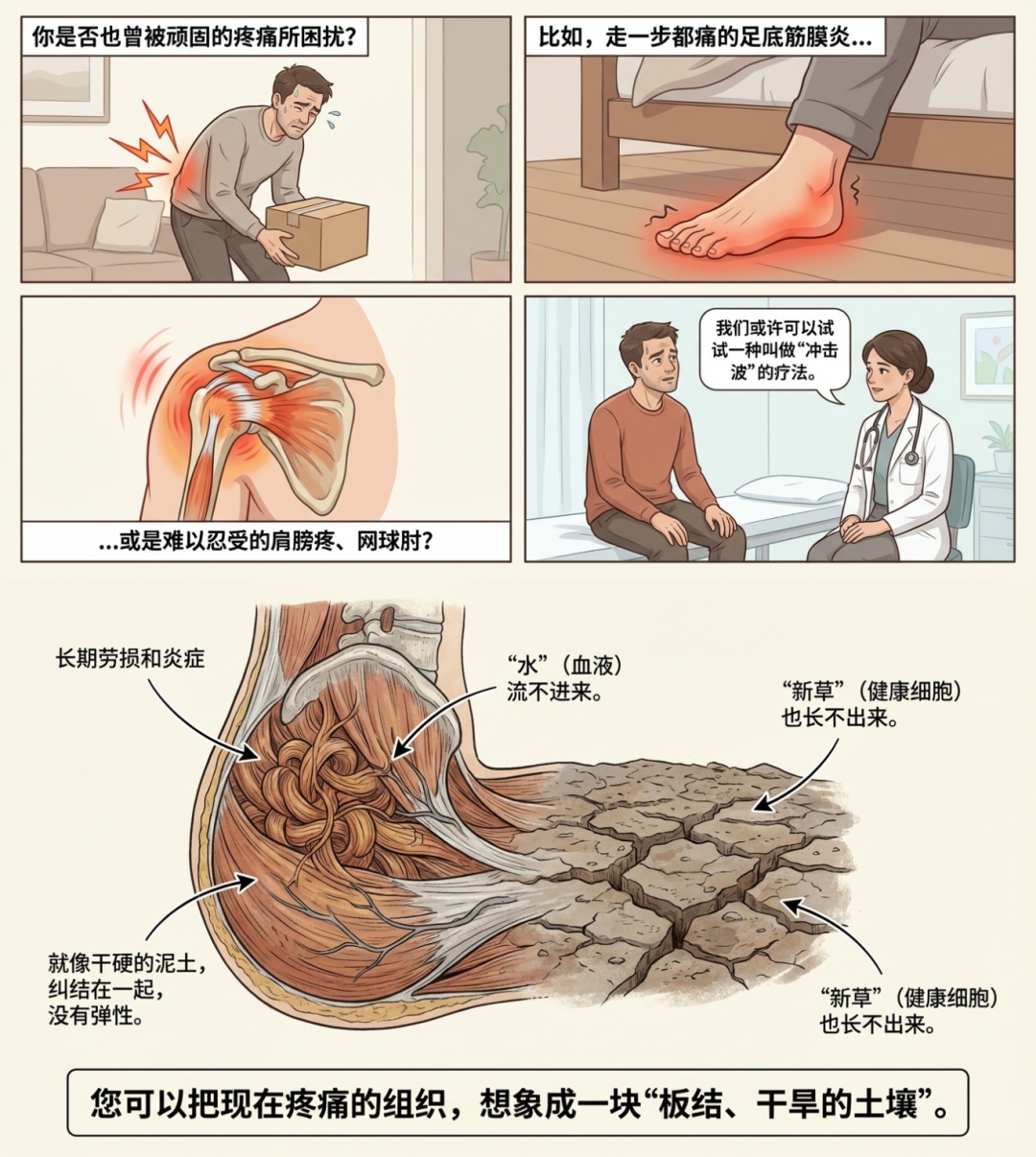 真相是:你的身体内部“荒废”了。 就像久旱不雨的土地,土壤(肌肉筋膜)板结在一起,水(血液)流不进,草(细胞)长不出。 今天同济大学附属同济医院骨科顾春雅技师带你看懂骨科康复界的“深层松土机”——冲击波。