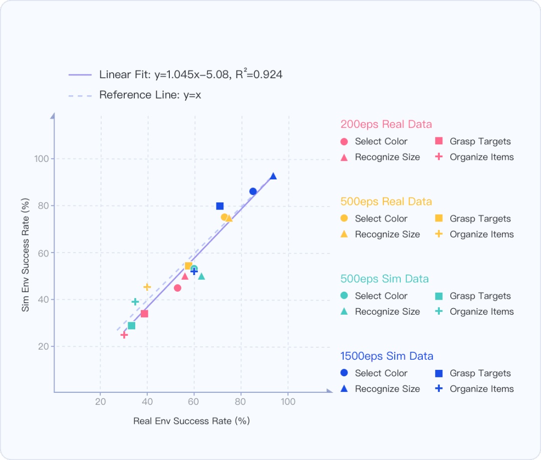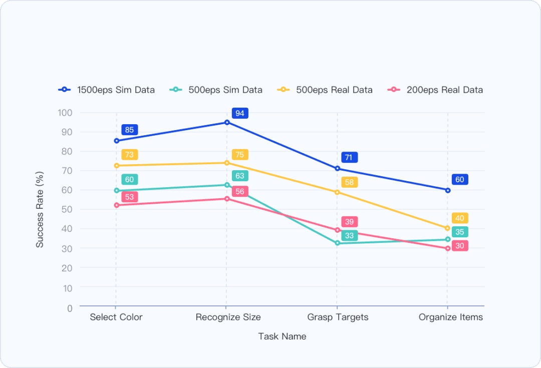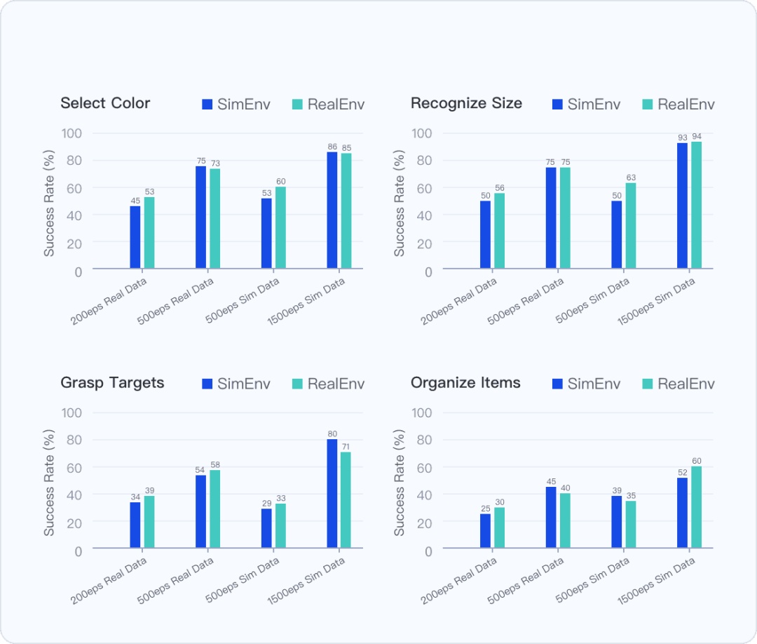 零样本Sim2Real:仿真数据训练完成后,实现零样本迁移到真实世界,任务成功率超过真实数据训练。