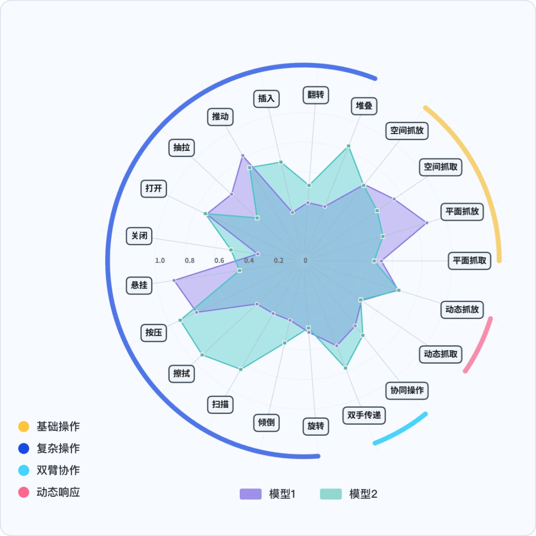 多维度深度评估:通过视觉语言模型(VLM),从语义理解、空间推理、操作精度、时序逻辑等多维度进行综合评价,清晰揭示模型的能力边界与薄弱环节,指引明确的优化方向。
