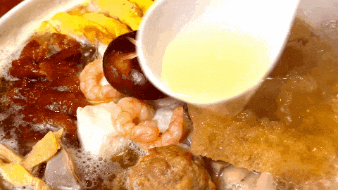 王宝和的全家福砂锅精选蛋饺、烤鸭、肉圆、猪肚、肉皮、鲜虾……等多种美味食材,款款都是手工精制而成,荤素食材加上高汤炖煮,口味丰富。