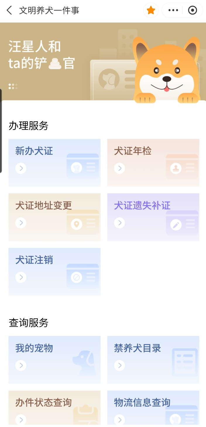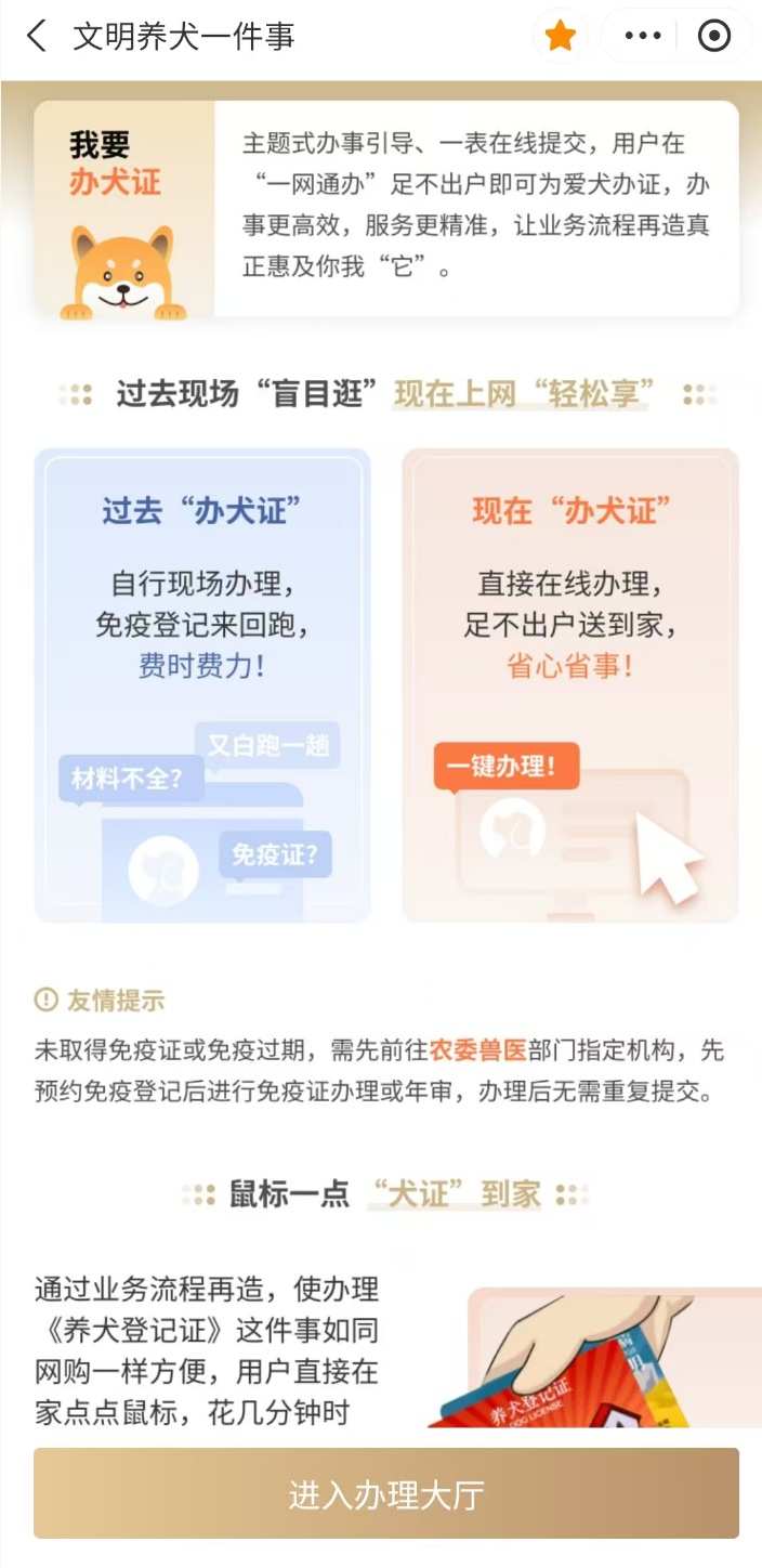 打开“随申办市民云”(APP/微信小程序/支付宝小程序),首页搜索关键词“养犬”,找到“文明养犬‘一件事’”服务,即可快速查询禁养犬目录,在线进行犬证新办、年检等事项,一起文明养犬!