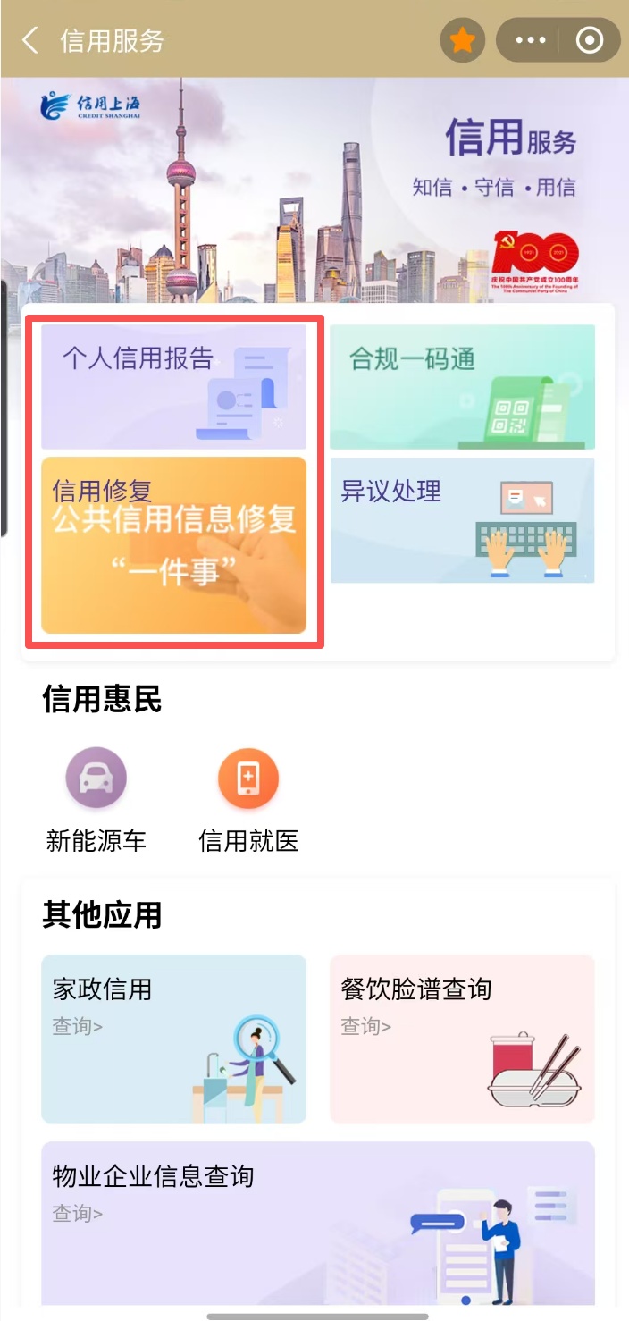 市民可通过“随申办市民云”(APP/微信小程序/支付宝小程序)“信用服务”,在线获取本人公共信用信息查询报告,申请公共信用信息修复。