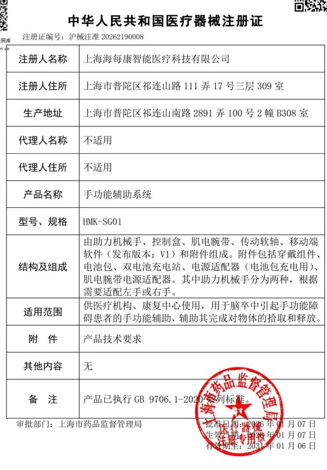 1月7日,普陀区企业上海海每康智能医疗科技有限公司成功获得国内第一张神经接口驱动的手功能辅助系统医疗器械注册证。这意味着用于脑卒中等疾病康复辅助治疗的手部外骨骼设备将加速走入患者生活。