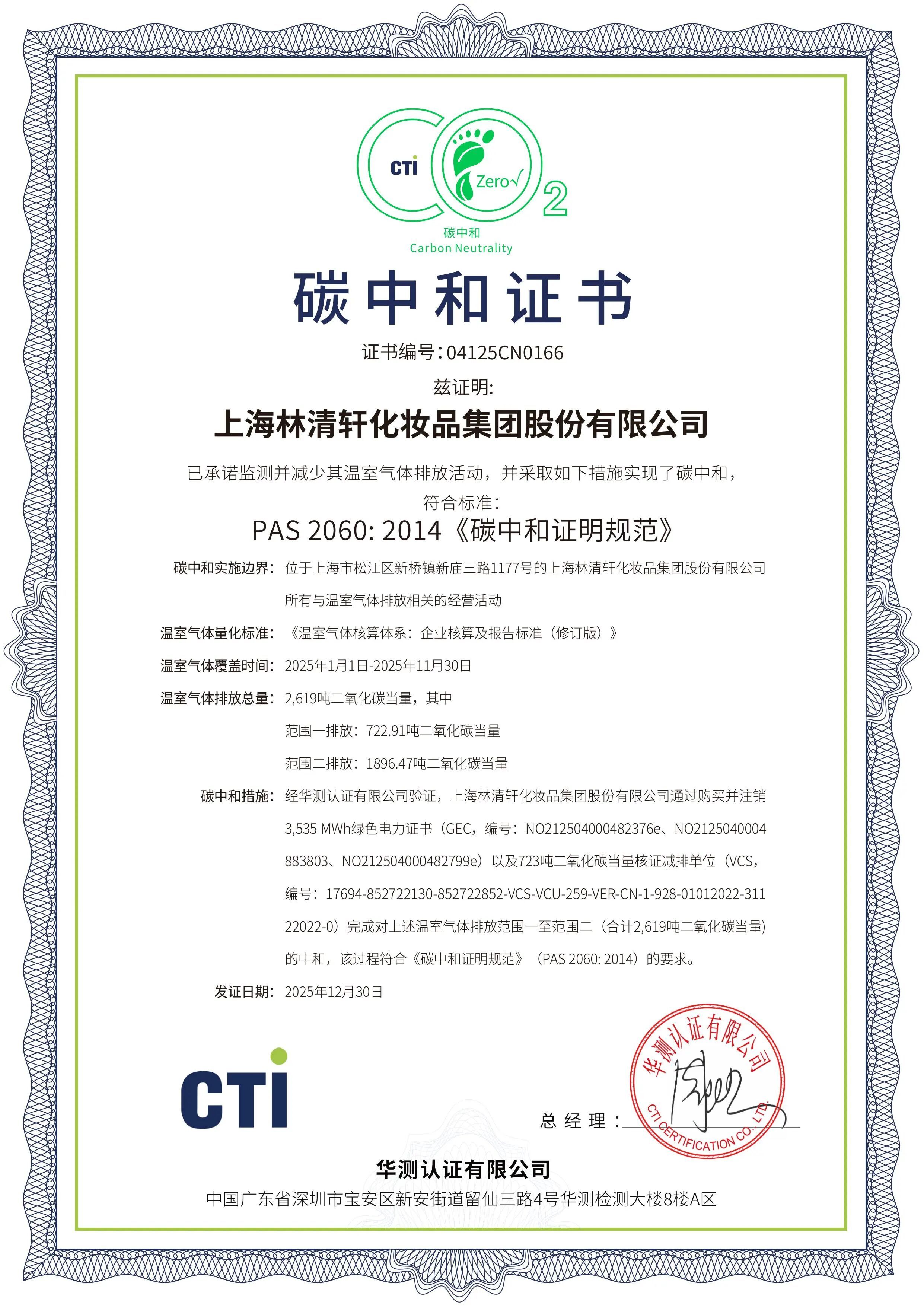 林清轩集团近日在港交所上市,当日同步获得由专业平台华测认证颁发的碳中和证书。其位于上海松江的科研智造基地自投产至2025年11月30日期间,实现运营碳排放全量中和,成为国内化妆品行业首个达成运营碳中和的企业。这一突破标志着中国美妆产业在低碳转型中迈出实质性步伐。