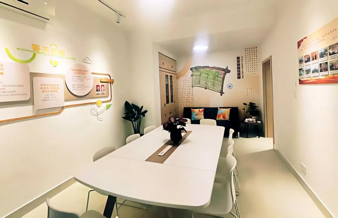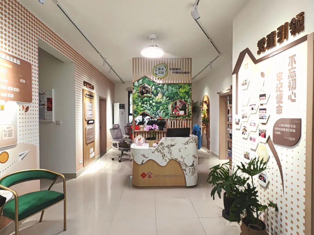 秉持着这样的改造理念,居民区以“春天里·睦邻春晓”为装修主题,重新划分功能区域,打造成门前休闲区、首问接待区、集中办公区、会客议事区四个功能区域,实现“议事+服务+互动”三合一功能。墙面融入春天花园区域图、党组织架构、居民自治机制、活动剪影展示等特色内容,形成一幅生动的社区故事画卷。舒适的桌椅、点缀的绿植、暖色调的灯光,打破办公空间的疏离感,营造出开放、包容的共享环境。居民不仅能来办事议事,还能随时来喝茶聊天,参与社区活动。