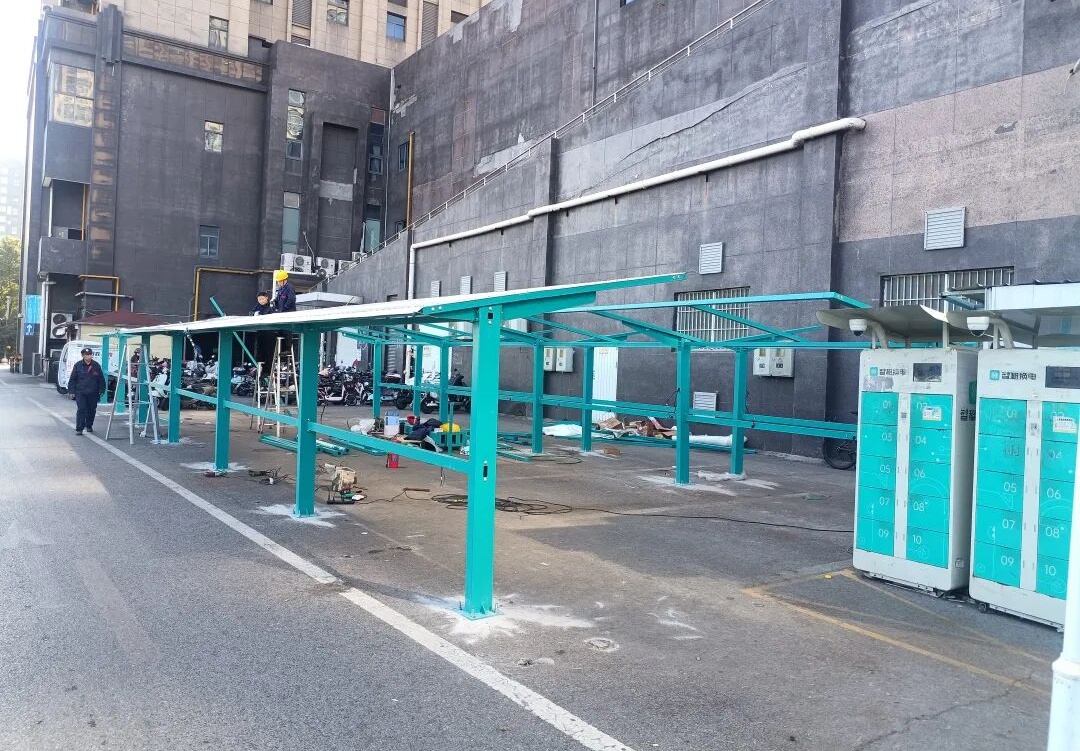 在日常网格巡查中,街区工作人员发现商圈内某超市员工停车棚老旧、充电不便,存在安全隐患。超市方面虽想改造,却受限于资金压力。对此,街区党支部主动作为,多次走访联动区域共建单位,最终为企业争取到免费安装新型智能充电车棚的机会。