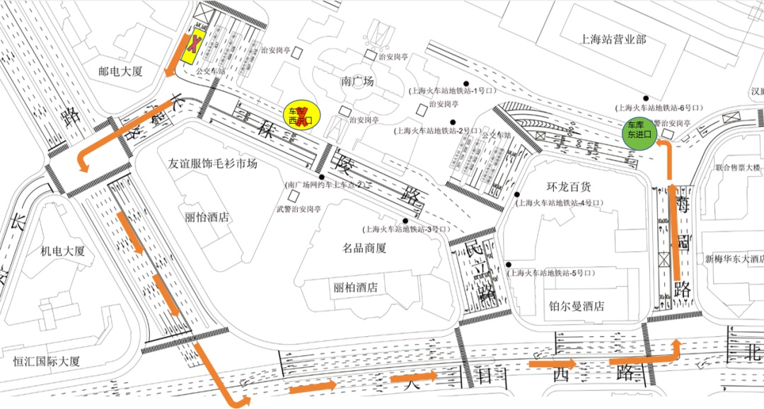 绕行方案:原计划由此入口进库的社会车辆,请提前绕行至秣陵路梅园路口的南广场地下停车库东入口进库。(绕行线路详见下图)