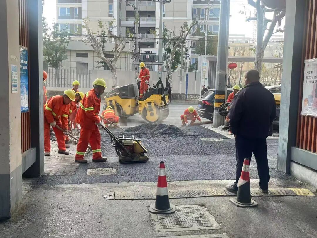 经过吴淞街道、宝山区交通建设管理中心的一番安排,淞滨路765弄小区门前区域的整治很快就被敲定。2025年12月11日上午,施工队来到现场,当天就“搞定”了这个项目,居民也非常配合。吴淞街道桃园新村居民区党总支书记表示:“当时市政养护的责任范围仅是一半区域,不包括人行道外侧,但他们非常给力,愿意帮忙,将本不属于其责任范围的区域一并铺设完成,门口商铺前也是坑坑洼洼比较严重,当时跟宝山区交建中心沟通后,一起铺掉了。”
