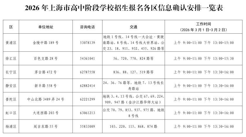 往届生和返沪生完成网上报名后,须于3月1日(星期日)至3月2日(星期一)前往报名所在区的招考机构,现场确认报名信息,确认时须带好报名证明材料(各区确认地点和时间,证明材料要求见下方)。