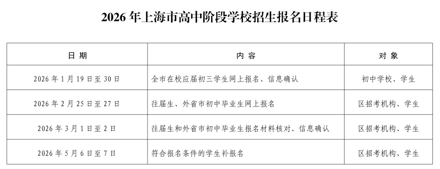 应届生可于1月19日(星期一)10:00起至1月30日(星期五)12:00,登录上海市教育考试院“上海招考热线”网站(www.shmeea.edu.cn)进行网上报名。请学生和家长(监护人)按照《2026年上海市高中阶段学校招生报名日程表》上的时间,根据学籍学校的统一安排进行网上报名和信息确认。学生务必在规定时间内完成网上报名,若在操作过程中遇到问题,请及时与学籍学校联系,由学校协助完成报名。