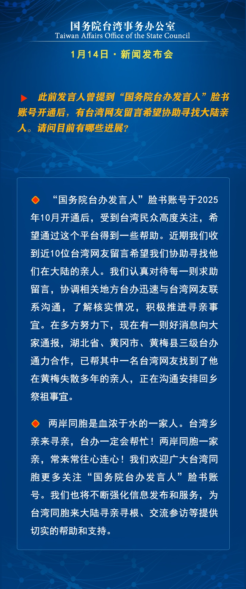 国台办:台湾乡亲来寻亲,台办一定会帮忙