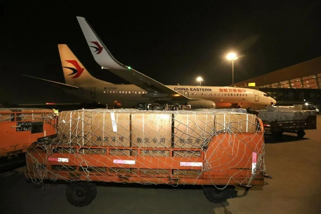 1月8日早晨07:00,东航MU2335航班从上海虹桥机场起飞,经停西安飞往拉萨,运送首支上海医疗队医护人员13名、棉衣棉被等7.45吨救灾物资飞赴地震灾区,全力支持日喀则抗震救灾工作。