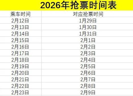 2026年春节即将来临,春运也将开始。按照目前火车票提前15天开始发售的规则,2月15日(腊月二十八)的火车票将在2月1日开抢。 据了解,2026年春节假期为2月15日(腊月二十八)至2月23日(正月初七)。按照全国铁路火车票预售期为15天(含当日),火车票会在2月1日统一发售。需要购票的市民可通过铁路12306官网、铁路12306 App等官方渠道购票,切莫找黄牛等不靠谱的渠道进行购票,避免影响行程。 2026年春运抢票时间表 由于不同火车站的车票网上起售时间并不相同,市民们要根据自己购票的车站查询具体起售时间,建议使用铁路12306 App上的起售时间查询功能进行查询。