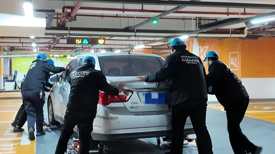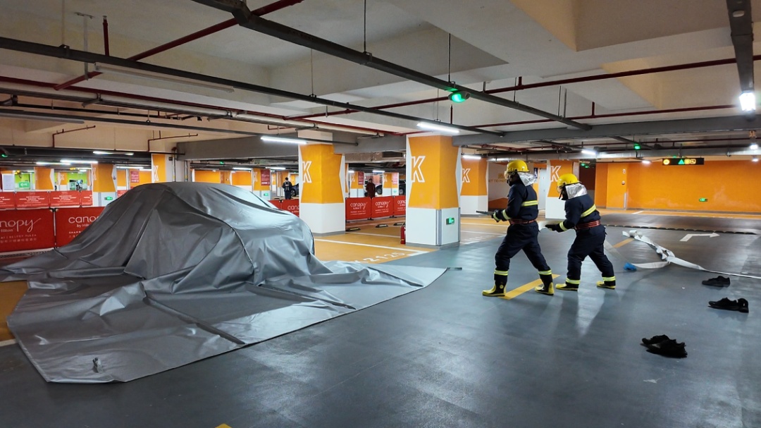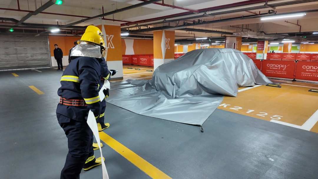 消控中心随即启动应急预案,利用移车器及时转移周围车辆,防止火势进一步扩大。与此同时,工作人员先用灭火毯覆盖自燃车辆,再使用消火栓持续 “灭火”。各单位人员协同配合,最终成功控制 “火情”,并达到安全处置标准。