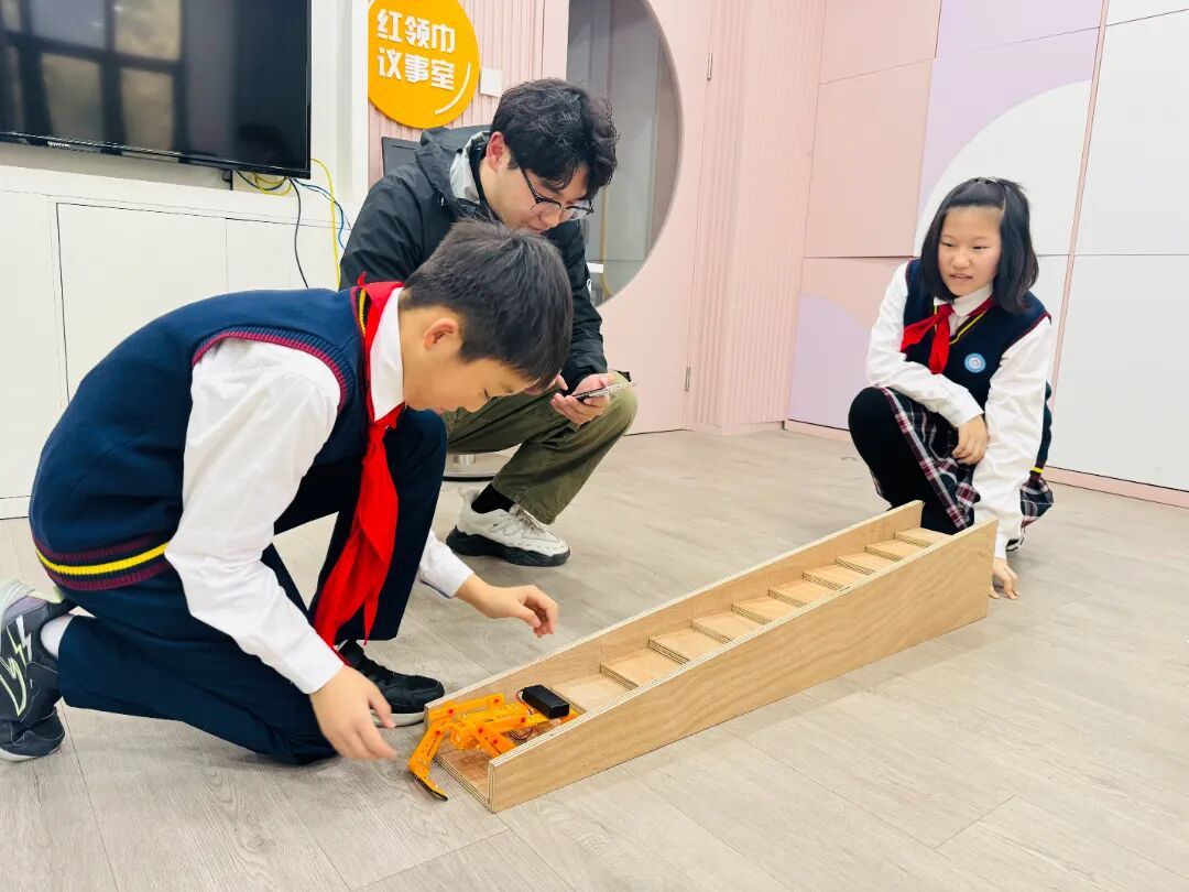 在上海市金山初级中学的实验教室内,学生杨墨正和同学们探讨如何拼搭机器人,使其关节自由度更高、结构更加稳定。
