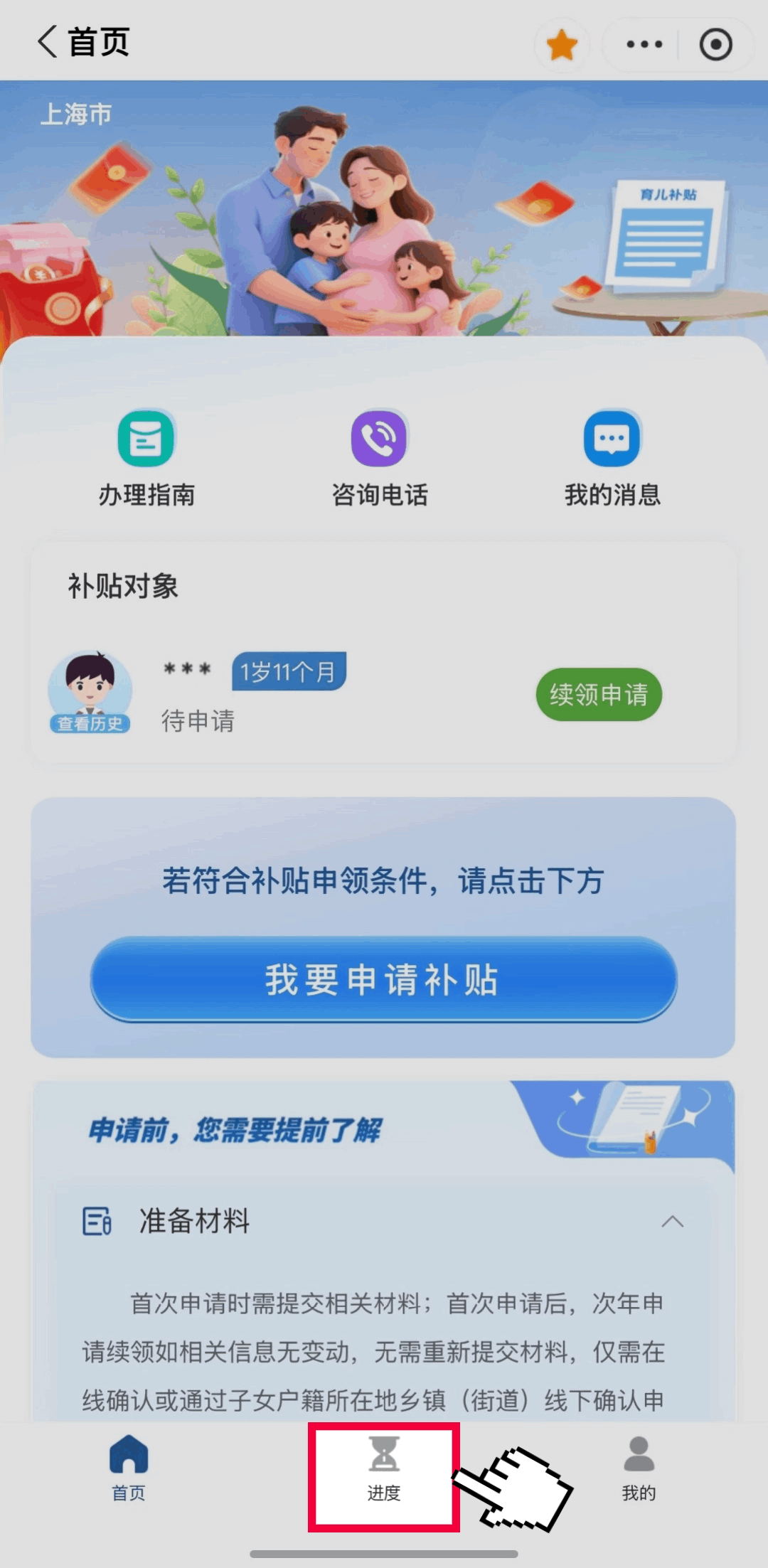 1.新手宝爸宝妈们,点击专区下方“立即申领”,选择“我要申请补贴”,查看办理须知及申请流程后,开始在线办理。