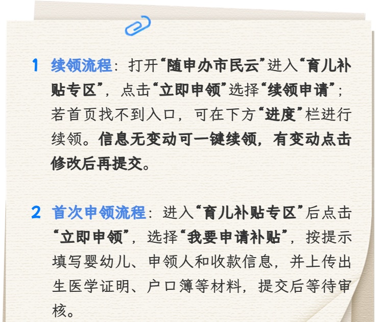 符合条件的宝爸宝妈们,赶快上“随申办市民云”在线申领吧!续领指南详见↓