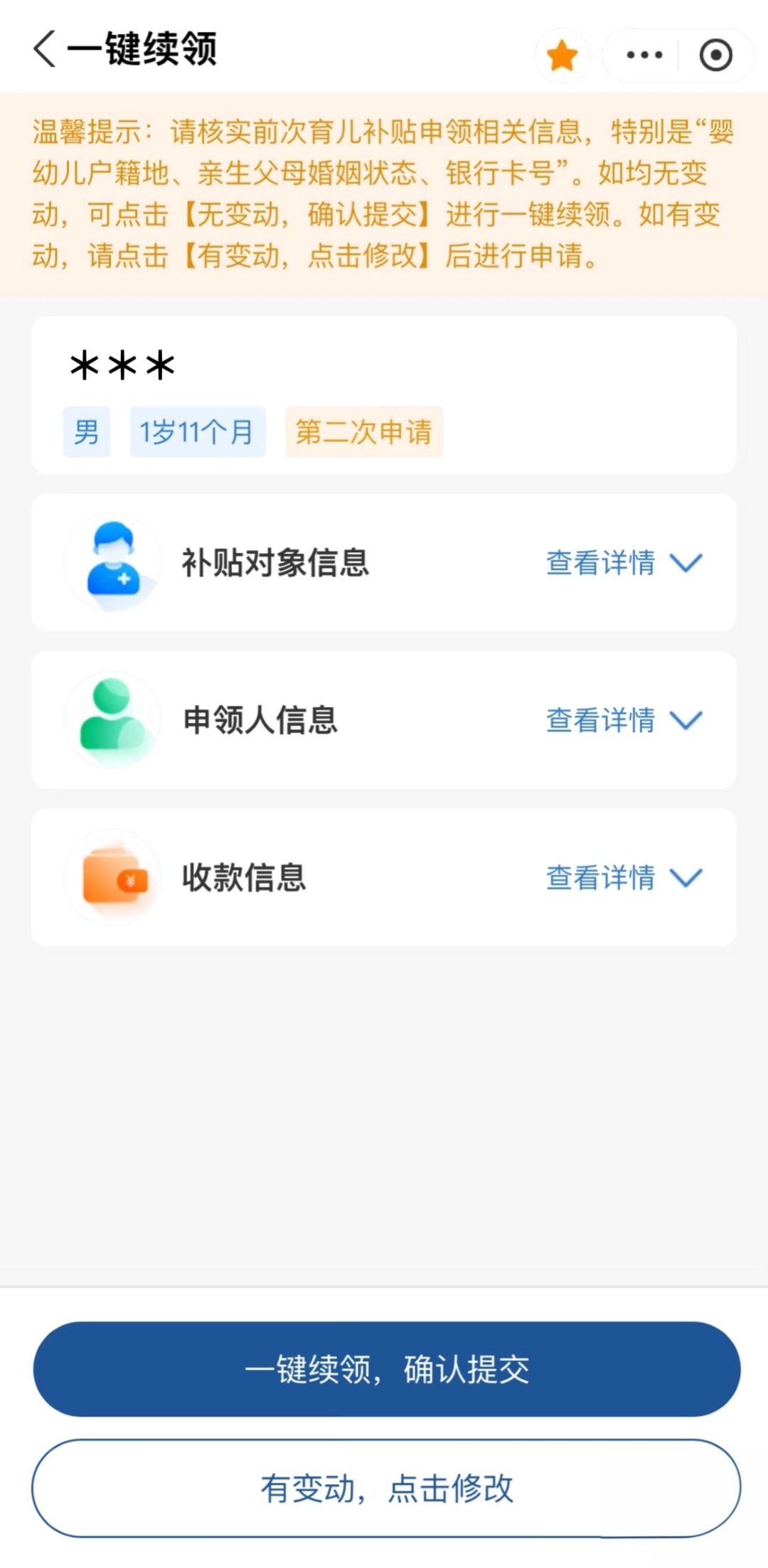 2.如果信息没有变化,则可直接进行一键续领操作;如果信息有变化,只需要点击修改,系统会将第一次申请信息自动带入,申领人只需针对有变动的内容进行修改再提交就可以了。