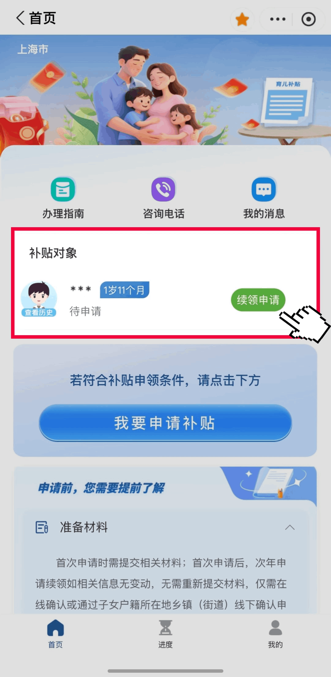 点击“育儿补贴专区”下方“立即申领”按钮,选择“续领申请”。