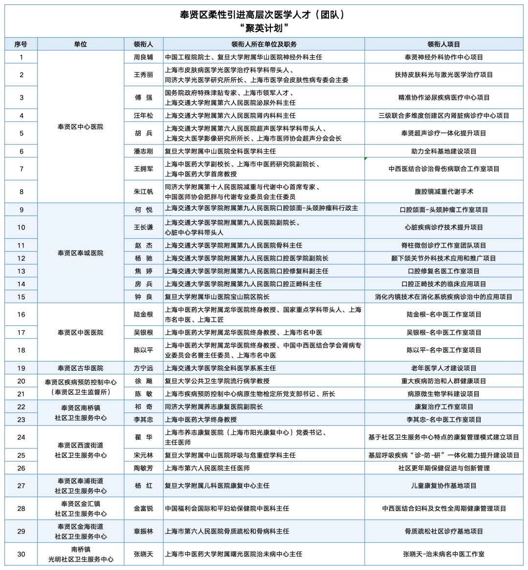 目前,“聚英计划”覆盖奉贤区中心医院、奉城医院、中医医院、古华医院、疾病预防控制中心(卫生监督所)及各街道(镇)社区卫生服务中心等14家医疗机构,涉及神经外科、皮肤科、口腔科、康复科、中医科、公共卫生等多个领域,引进中国工程院院士、复旦大学附属华山医院神经外科主任周良辅,上海市医学会皮肤性病专委会主委王秀丽,上海交通大学医学院附属第九人民医院口腔颌面头颈肿瘤科主任医师何悦等领衔的30位高层次医学人才(团队),形成“需求导向、多元引才、规范管理、动态优化”的项目推进格局。