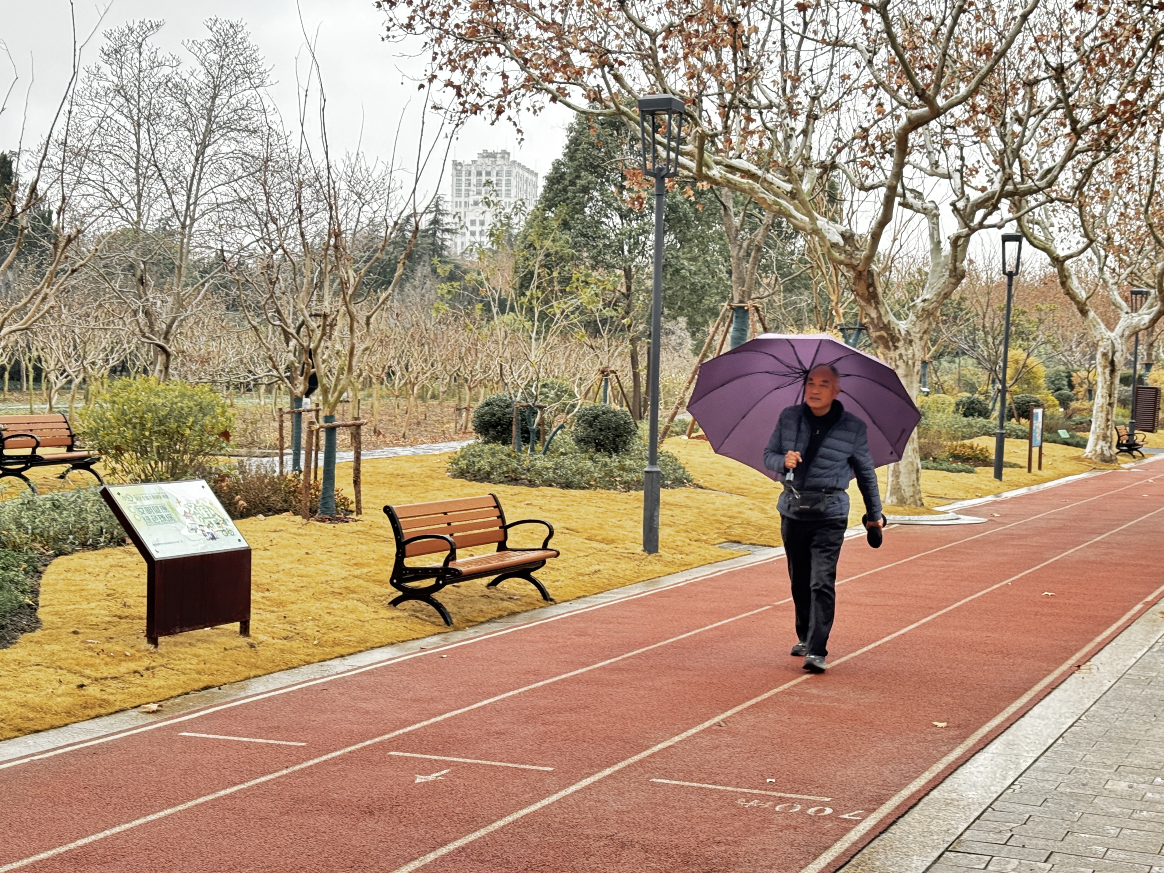 上午9时,松江城区天空阴云密布,绵绵细雨随风飘落,空气中雾气氤氲,能见度有所下降。阵阵寒风裹挟着高湿度袭来,室外体感温度较昨日大幅走低。在中央公园,枝头残存的枯叶在寒风中簌簌飘落,园内往来市民皆穿戴严实,护耳帽、羽绒服、手套成了出行标配。公园步道上,不少市民撑着雨伞或身着防水外套,依旧坚持慢跑、健步,在寒风细雨中保持着日常的运动节奏。“今天下毛毛雨,天明显冷了,出门特意加了帽子和羽绒服。”前来跑步的市民唐建武说。